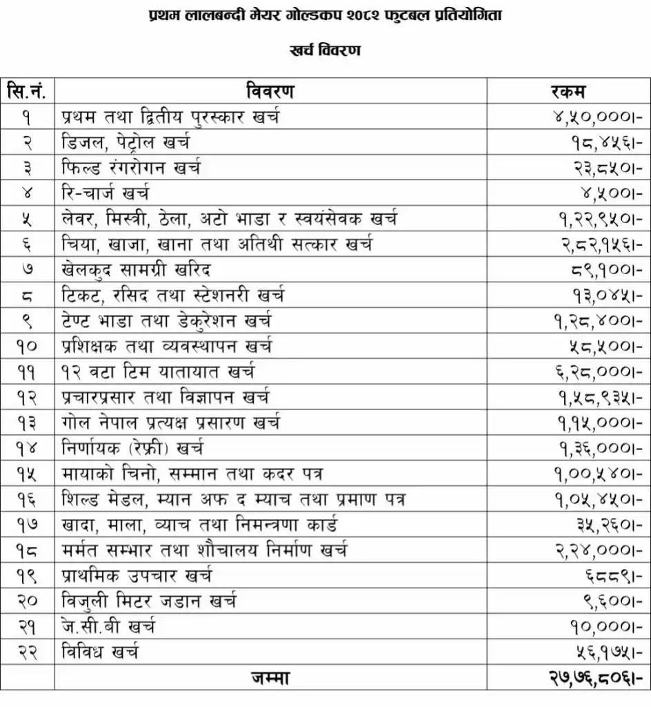 प्रथम लालबन्दी मेयर गोल्डकप फुटबल प्रतियोगिता २०८२ को आयव्यय विवरण सार्वजनिक गरिएको छ ।