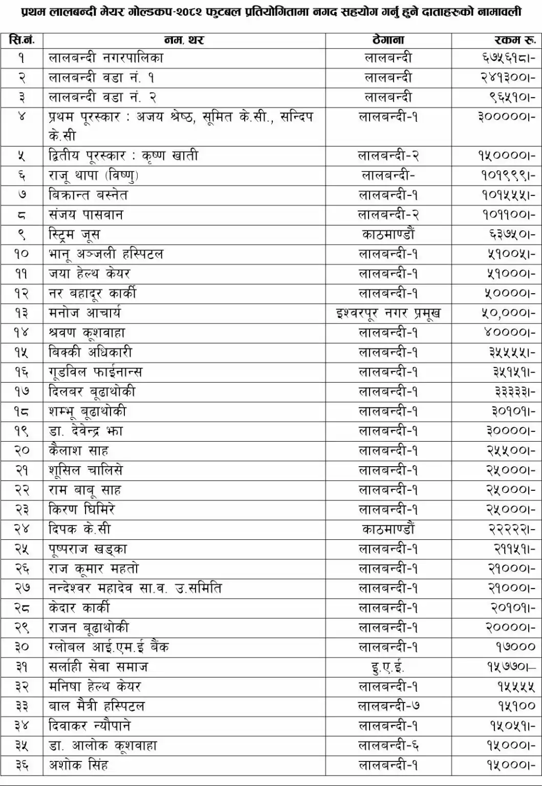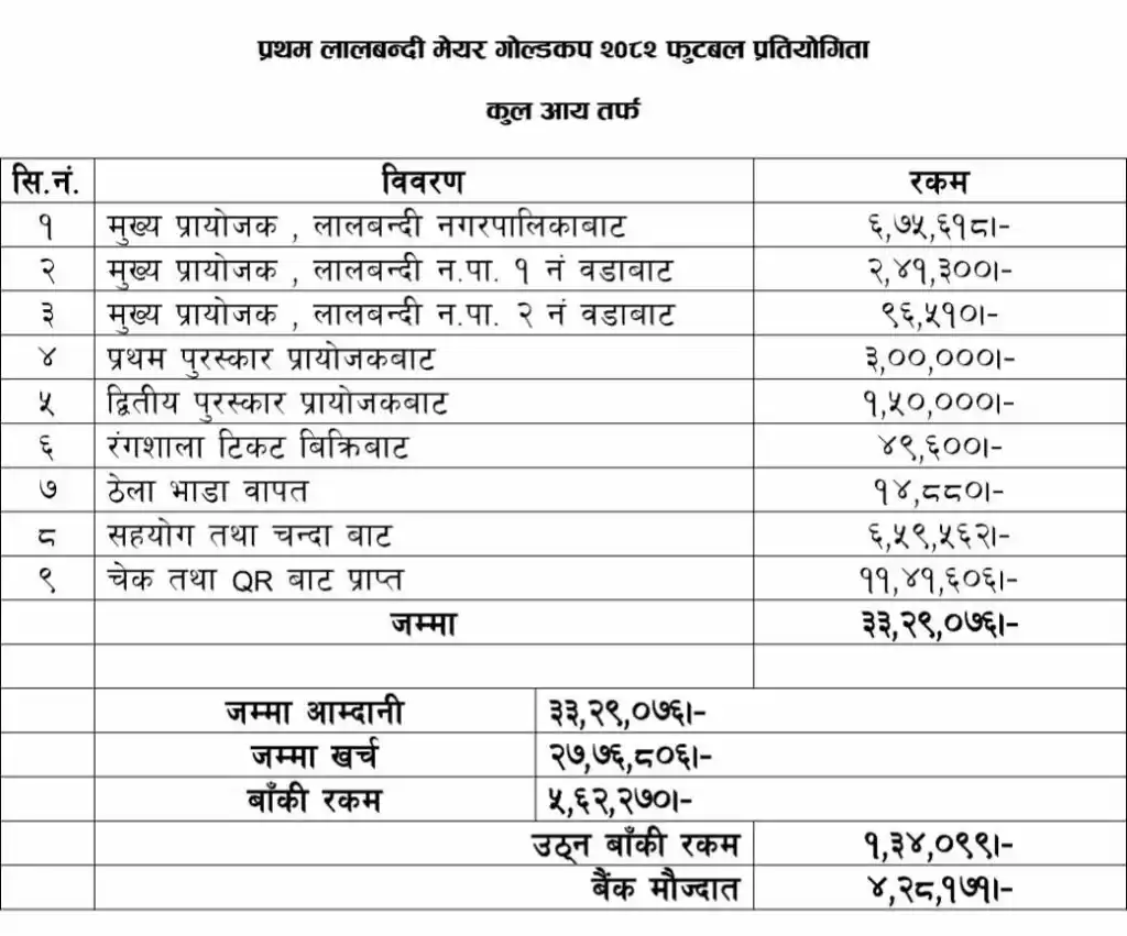 प्रथम लालबन्दी मेयर गोल्डकप फुटबल प्रतियोगिता २०८२ को आयव्यय विवरण सार्वजनिक गरिएको छ ।