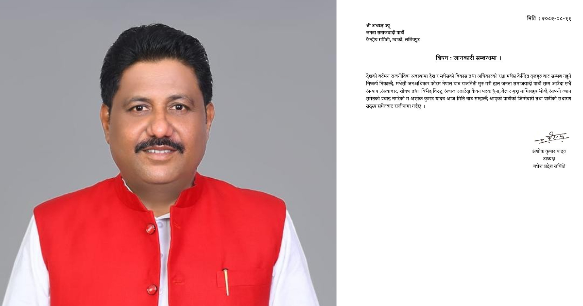 ११ मंसिर, काठमाडौं । जनता समाजवादी मधेश प्रदेश अध्यक्ष अशोककुमार यादवले पार्टी छाडेका छन्…