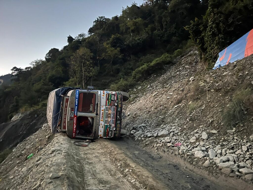 कान्तिलोकपथमा औषधि बोकेको ट्रक ब्रेकफेल भई दुर्घटना, सडक पूर्ण अवरुद्ध