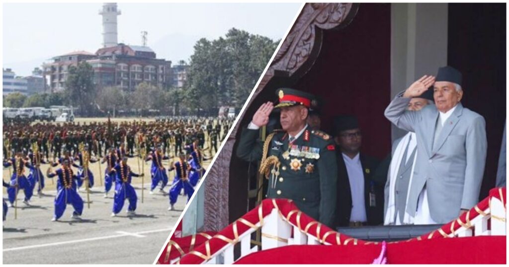 २५ फागुन, काठमाडौं । नेपाली सेनाले आफ्नो स्थापनाको २६१औं वार्षिकोत्सवको अवसरमा आज शुक्रबार काठमाडौंको टुँडिखेलमा विविध सैनिक कला, सांस्कृतिक एवं साङ्गीतिक प्रस्तुति दिएको छ । सेनाले महाशिवरात्रिको दिनलाई सेना दिवसका रूपमा मनाउँदै आएको छ । टुँडिखेलमा आयोजित समारोहमा राष्ट्रपति रामचन्द्र पौडेलसहित उच्च पदस्थ अधिकारीहरुको सहभागिता थियो । सैनिक मञ्चमा आयोजित समारोहमा परेड (शस्त्राभ्यास) तथा तोप […]