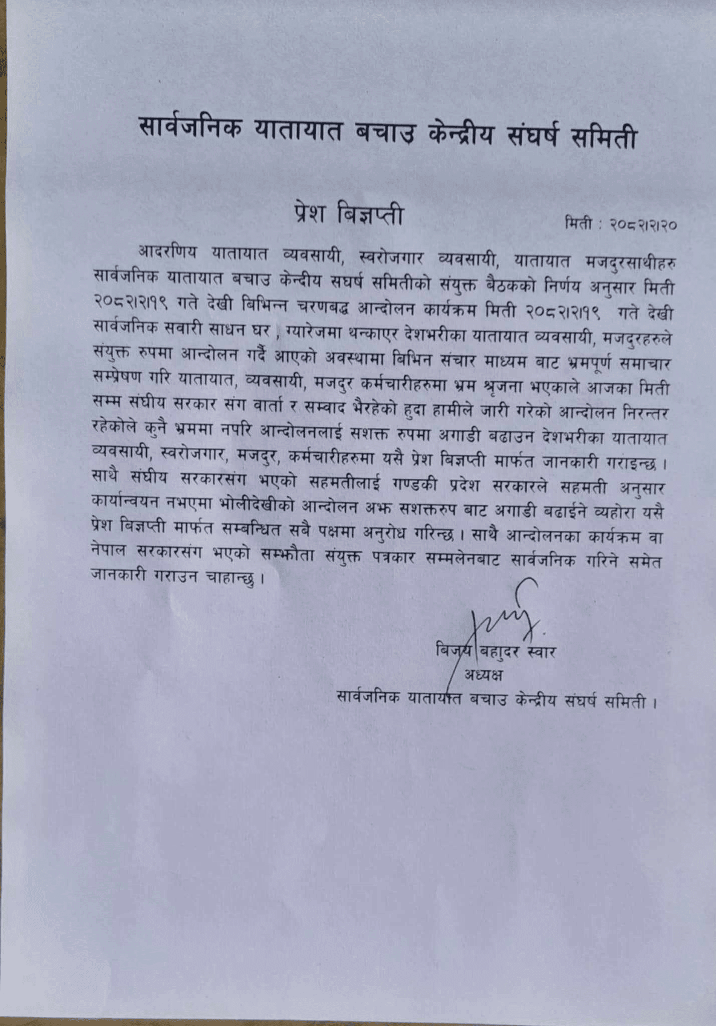 ‘सङ्घीय सरकारसँग भएको सहमतिलाई गण्डकी प्रदेश सरकारले सहमति अनुसार कार्यान्वयन नभएमा भोलीदेखिको आन्दोलन अझ सशक्त रुपबाट अगाडी बढाइने ब्यहोरा यसै प्रेस विज्ञप्ति मार्फत सम्बन्धित सबै पक्षमा अनुरोध गरिन्छ,’ सार्वजनिक यातायात बचाउ केन्द्रीय सङ्घर्ष समिति अध्यक्ष विजय बहादुर स्वारद्धारा हस्ताक्षरित प्रेस विज्ञप्तिमा भनिएको छ ।