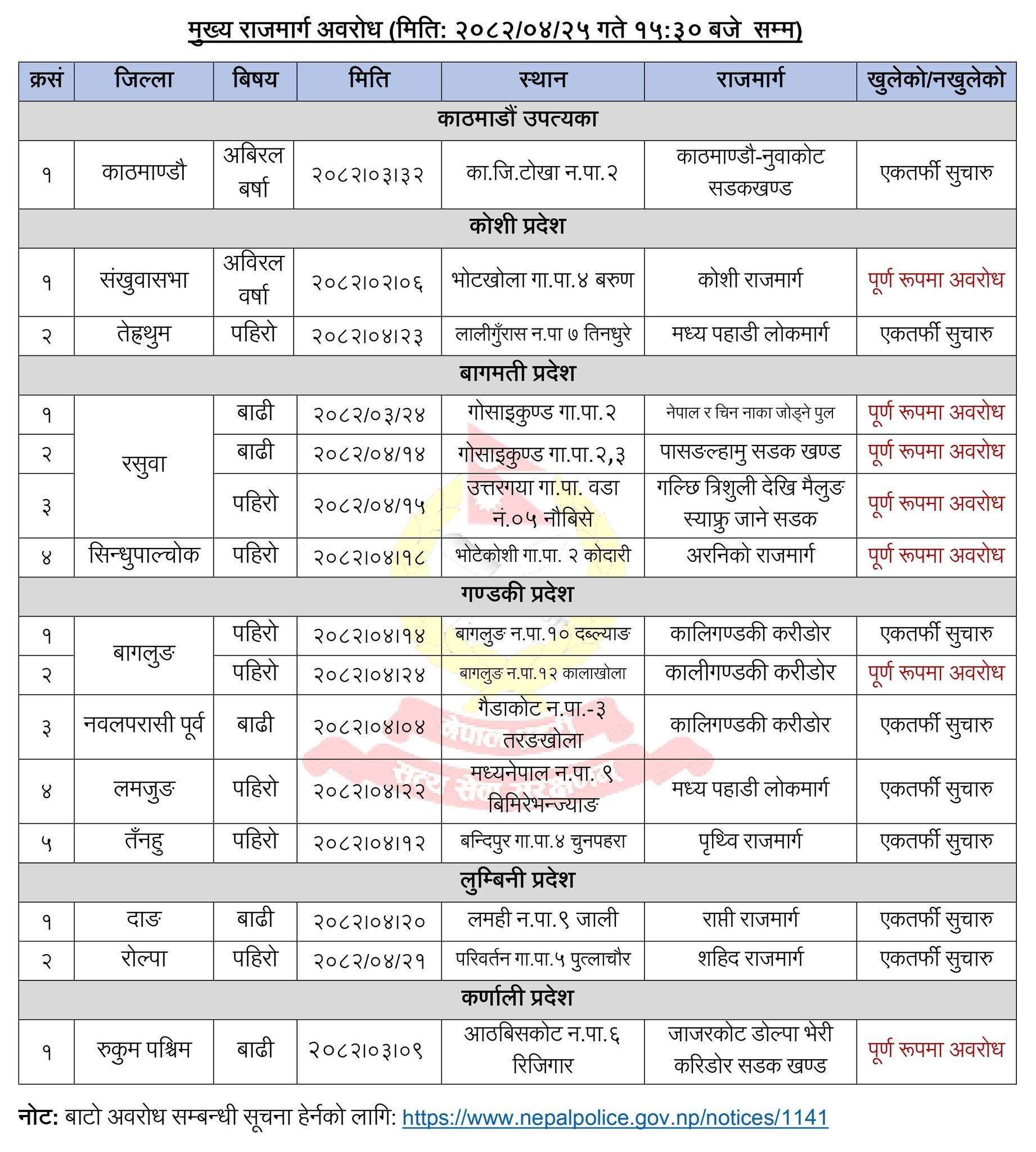 त्यसैगरी पासाङ लहामु सडक खण्डको रसुवाको गोसाईंकुण्ड गाउँपालिका २,३ र उत्तरगया गल्छि त्रिशुली सडक अवरुद्ध भएको हो । त्यस्तै अरनिको राजमार्ग अन्तर्गत भोटेकोशी कोदारी राजमार्ग पनि पूर्ण रूपमा अवरुद्ध भएको छ । गण्डकी प्रदेशमा कालीगण्डकी करीडोर तथा रुकुम पश्चिममा जाजरकोट डोल्पा भेली करिडोर सडक अवरुद्ध भएको छ ।