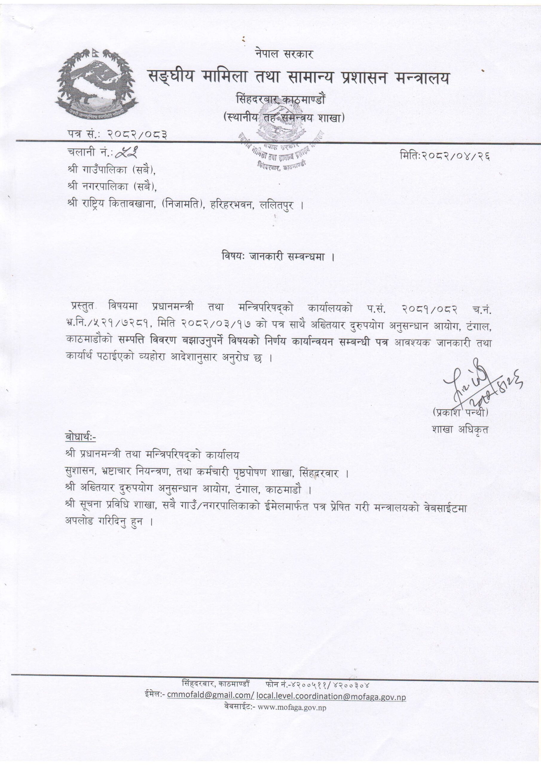 सरकारले सार्वजनिक पद धारण गरेका व्यक्तिहरूका लागि सम्पत्ति विवरण बुझाउने व्यवस्थालाई थप कडा बनाउने भएको छ । अबदेखि नयाँ नियुक्ति पाउने राष्ट्रसेवकले नियुक्ति पत्र लिनुअघि नै आफ्नो सम्पत्ति विवरण अनिवार्य रूपमा बुझाउनुपर्ने भएको छ । अख्तियार दुरुपयोग अनुसन्धान आयोगको सिफारिसमा प्रधानमन्त्री तथा मन्त्रिपरिषद्को कार्यालय हुँदै सङ्घीय मामिला तथा सामान्य प्रशासन मन्त्रालयले मातहतका सबै निकायलाई यस्तो निर्देशन जारी गरेको हो ।