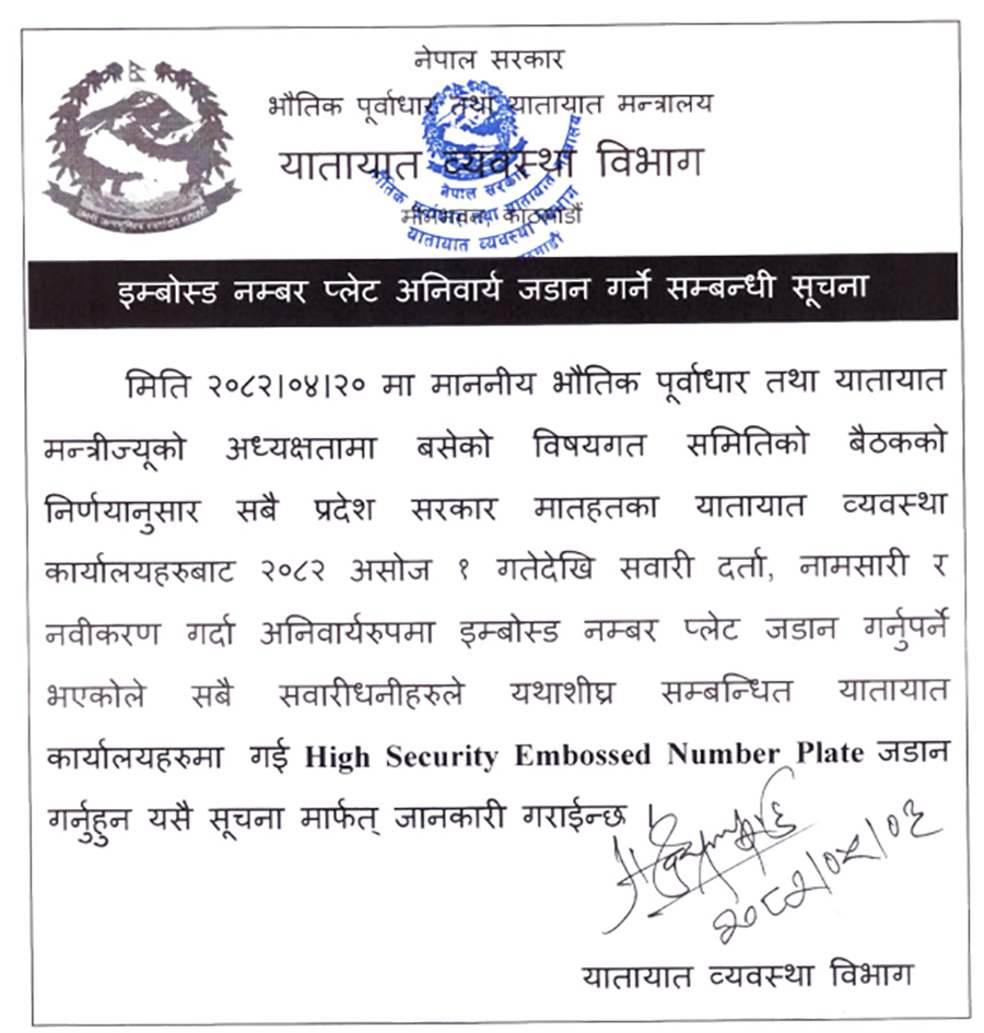 यातायात व्यवस्था विभागले आगामी १ असोजदेखि अनिवार्य रूपमा इम्बोस्ड नम्बर प्लेट जडान गर्न सवारी धनीहरूलाई अनुरोध गरेको छ । विभागले मंगलबार एक सूचना जारी गर्दै १ असोजदेखि सवारी दर्ता, नामसारी र नवीकरण गर्दा अनिवार्य इम्बोस्ड नम्बर प्लेट जडान गर्नु पर्ने व्यवस्था गरेको छ ।