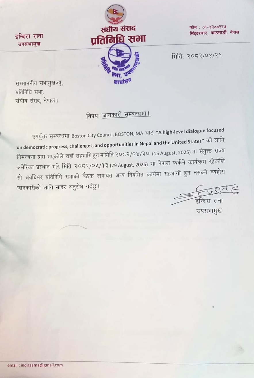 बिना जानकारी अमेरिका गएको भनेर संसदमै प्रश्न उठेपछि उपसभामुख इन्दिरा राना मगरको सचिवालयले सभामुखलाई जानकारी गराएर गएको बताएको छ । अमेरिका जानु अगाडि सभामुखसँग भेट भएको र औपचारिक रुपमा जानकारी पत्र समेत दिइएको भनेर उक्त पत्र सार्वजनिक गरेको छ । साउन २१ गतेको उक्त पत्रमा साउन ३० गते अमेरिका गएर भदौ १३ गते फर्किने उल्लेख छ ।