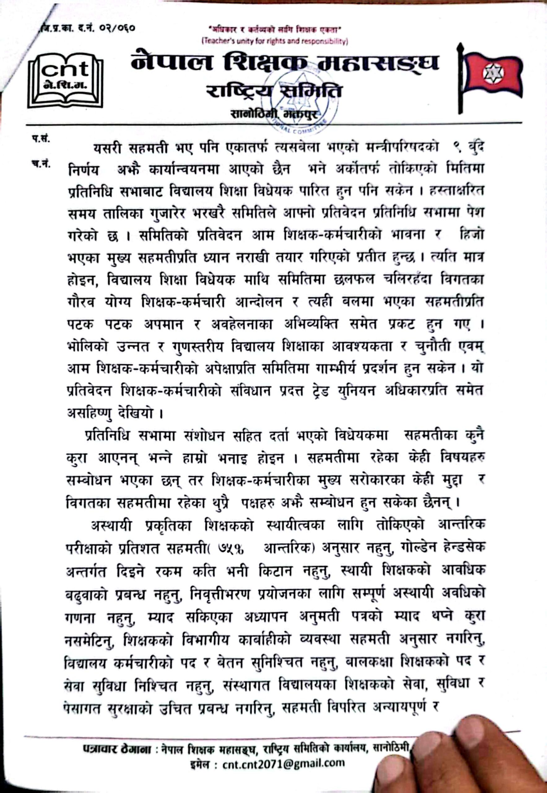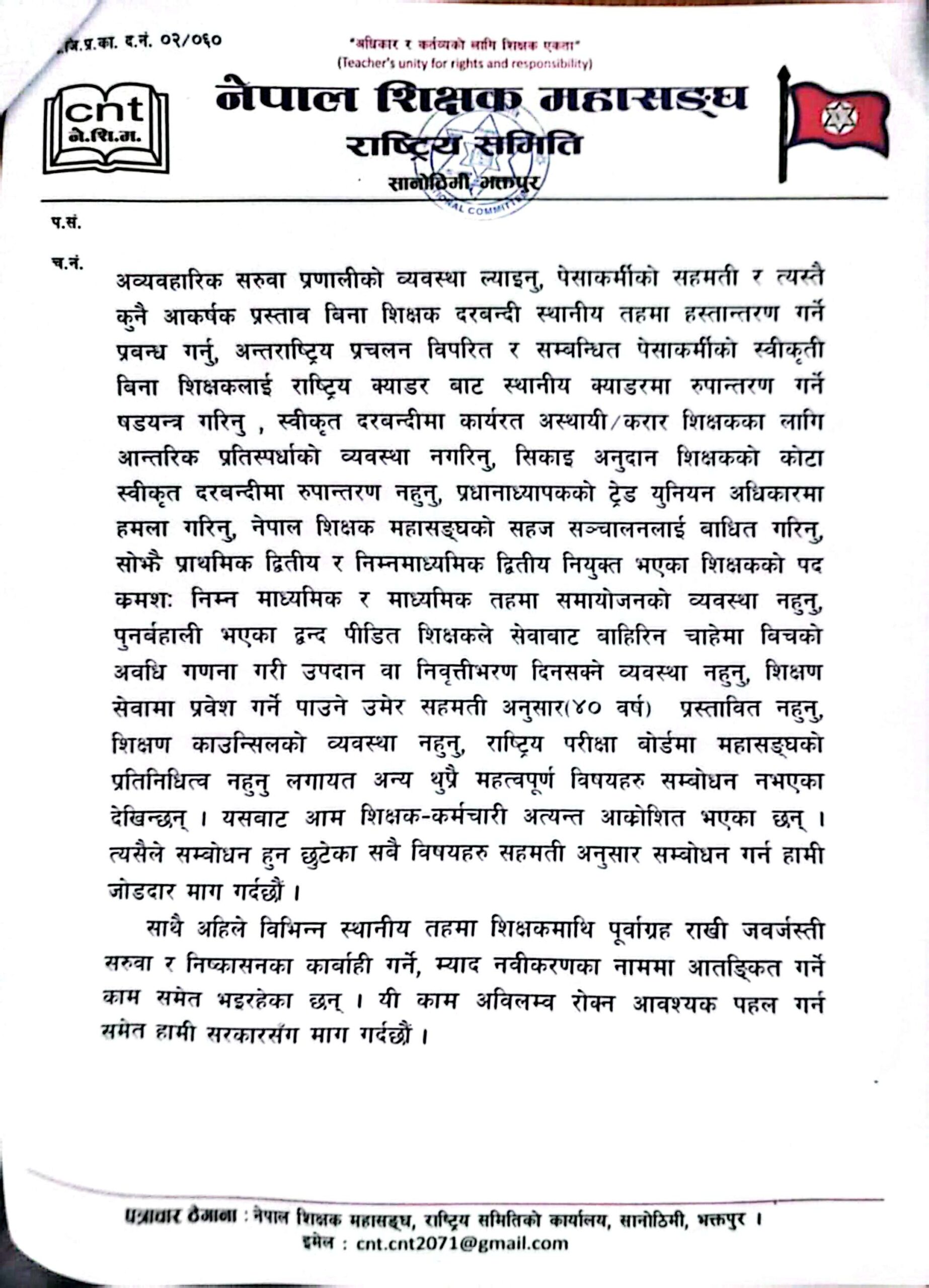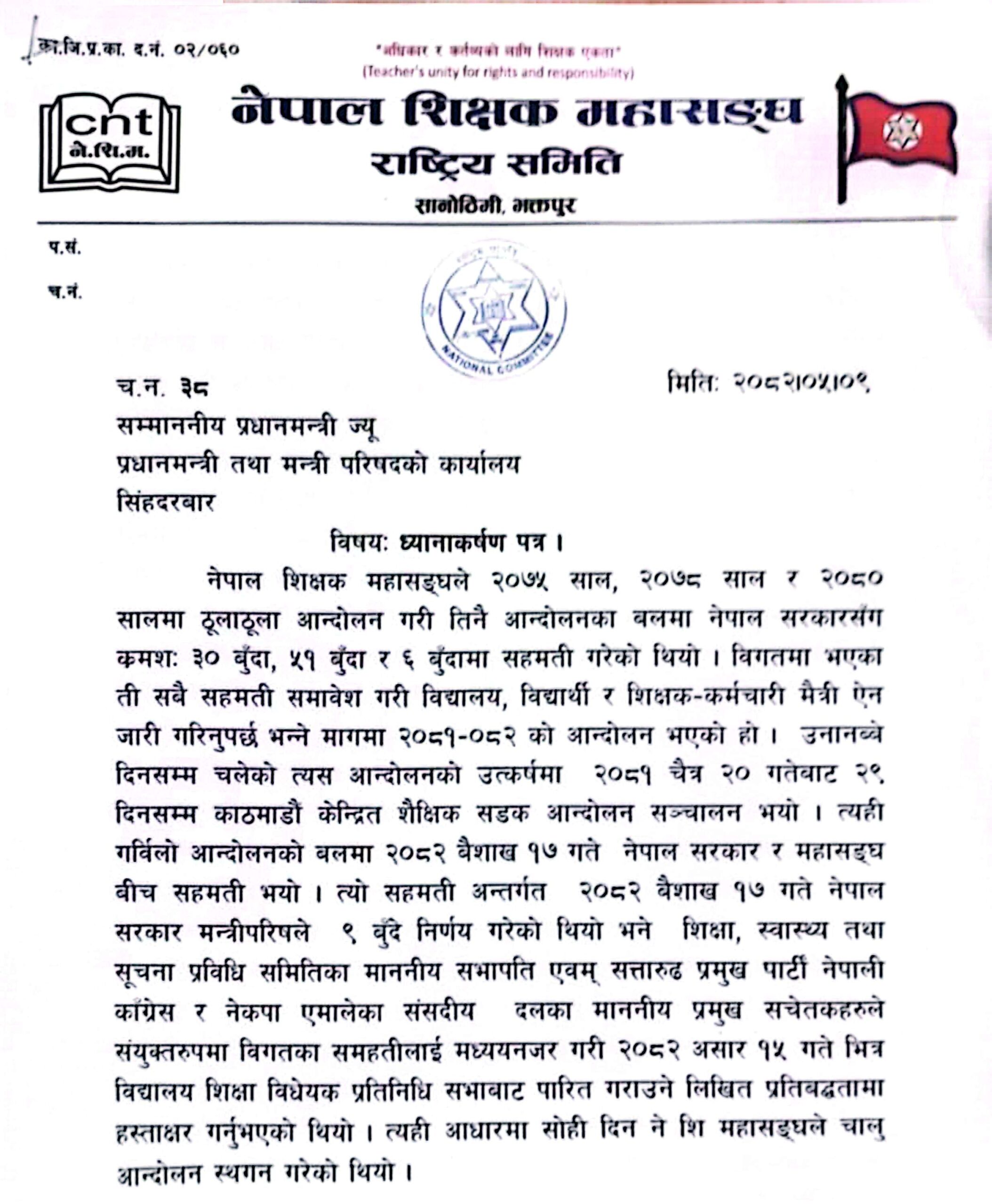 नेपाल शिक्षक महासंघले पहिलो चरणका आन्दोलनका कार्यक्रम आज देखि सुरु भएको छ । घोषणा गरिएको कार्यक्रमअनुसार प्रधानमन्त्री, शिक्षामन्त्री र राजनीतिक दलका प्रमुख सचेतकलाई ध्यानाकर्षण पत्र बुझाइएको हो ।
