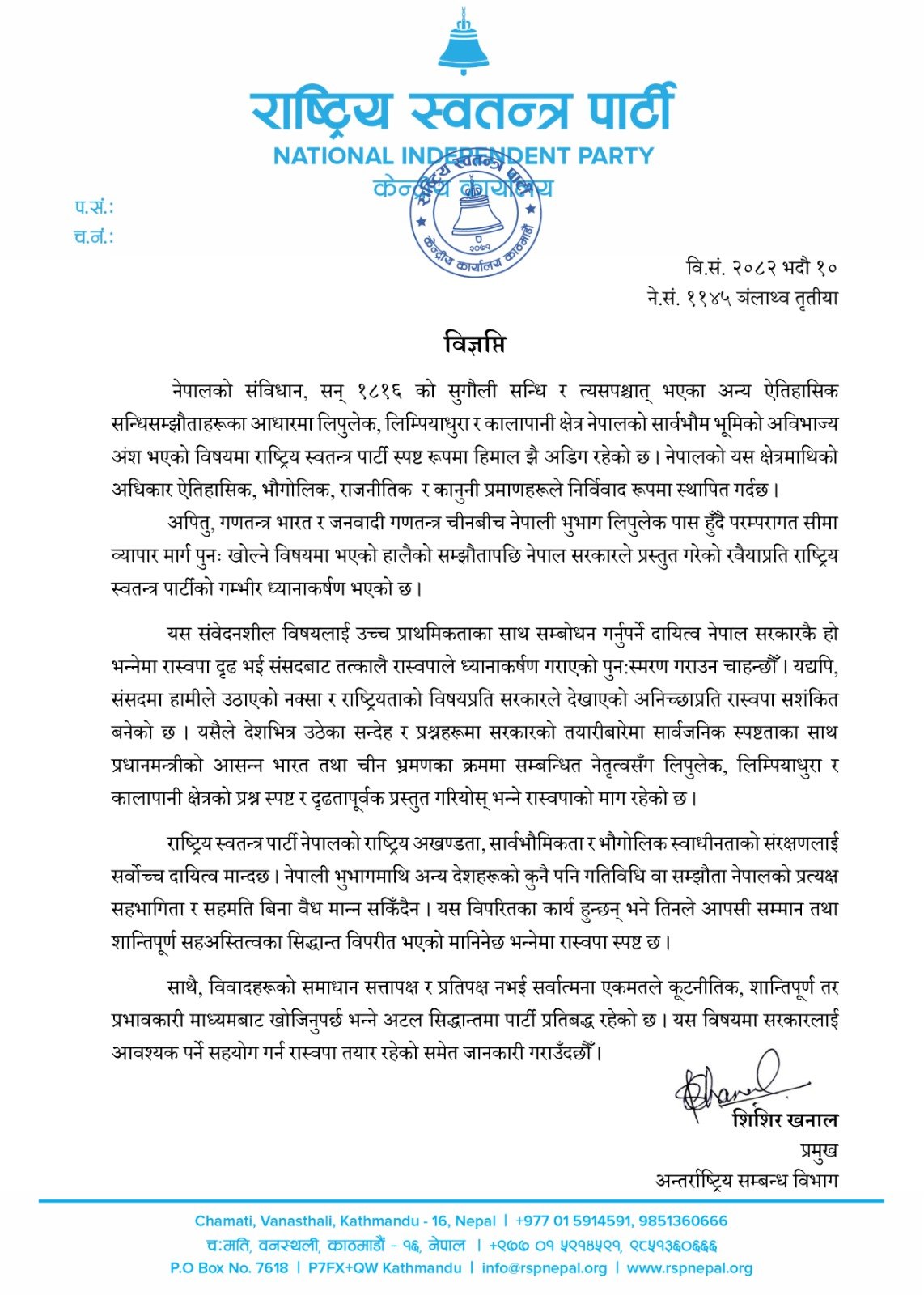 विज्ञप्तिमा भनिएको छ,‘राष्ट्रिय स्वतन्त्र पार्टी नेपालको राष्ट्रिय अखण्डता, सार्वभौमिकता र भौगोलिक स्वाधीनताको संरक्षणलाई सर्वोच्च दायित्व मान्दछ । नेपाली भू–भागमाथि अन्य देशहरूको कुनैपनि गतिविधि वा सम्झौता नेपालको प्रत्यक्ष सहभागिता र सहमति बिना वैध मान्न सकिँदैन । यस विपरितका कार्य हुन्छन् भने आपसी सम्मान तथा शान्तिपूर्ण सहअस्तित्वका सिद्धान्त विपरित भएको मानिनेछ भन्नेमा रास्वपा स्पष्ट छ ।’