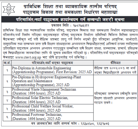 प्राविधिक शिक्षा तथा व्यावसायिक तालिम परिषद्ले छ वटा नयाँ तथा परिमार्जित पाठ्यक्रमहरू कार्यान्वयनमा ल्याउने भएको छ। परिषद्को पाठ्यक्रम विकास तथा समकक्षता निर्धारण महाशाखाले सो सम्बन्धी एक जरुरी सूचना जारी गर्दै यसको जानकारी दिएको हो।