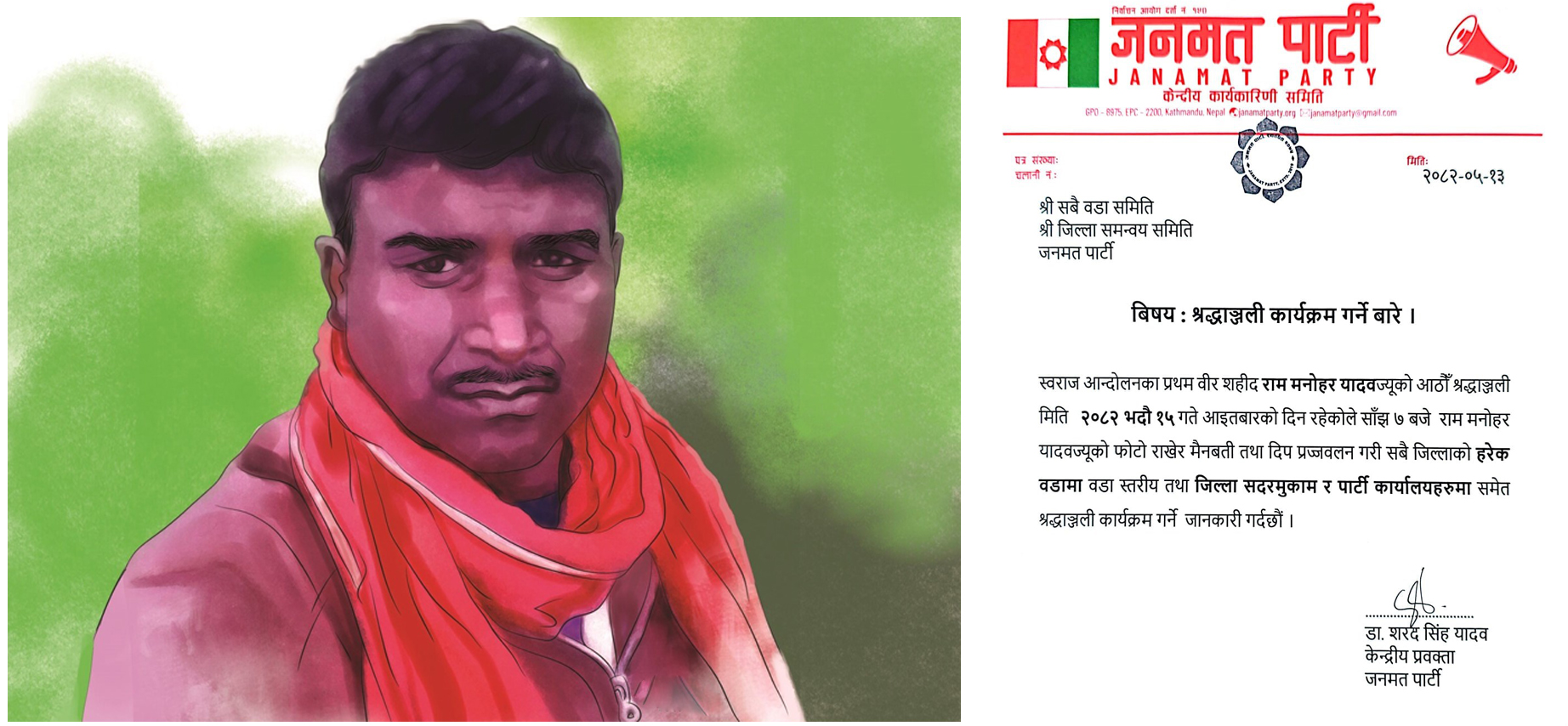श्रद्धाञ्जली कार्यक्रममा शहिद राम मनोहर यादवको फोटो राखी मैनबत्ती तथा दिप प्रज्वलन गरिने जनाइएको छ । प्रत्येक जिल्लाका सबै वडामा, जिल्ला सदरमुकाममा तथा पार्टी कार्यालयहरुमा एकैसाथ श्रद्धाञ्जली कार्यक्रम हुने जनमत पार्टीले जानकारी दिएको छ । स्वराज आन्दोलनका क्रममा नेपाल सरकारका तत्कालिन उपप्रधानमन्त्री उपेन्द्र यादवलाई कालो झण्डा देखाउने क्रममा पक्राउ गरी राम मनोहर यादवको हत्या भएको थियो । स्व.यादव जनमत पार्टीको एक मात्र शहीद हुन् ।