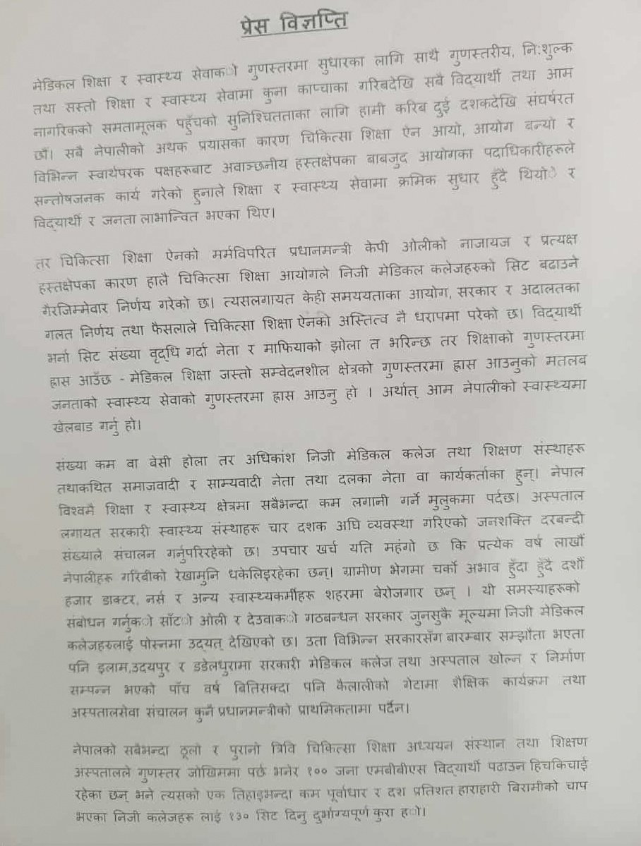 विद्यार्थी भर्ना सिट संख्या वृद्धि गर्दा नेता र माफियाको झोला भरिने तर शिक्षाको गुणस्तरमा ह्रास आउने डा. केसीको भनाइ छ । ‘मेडिकल शिक्षा जस्तो सम्वेदनशील क्षेत्रको गुणस्तरमा ह्रास आउनुको मतलब जनताको स्वास्थ्य सेवाको गुणस्तरमा ह्रास आउनु हो । अर्थात् आम नेपालीको स्वास्थ्यमा खेलबाड गर्नु हो,’ विज्ञप्तिमा उल्लेख छ ।