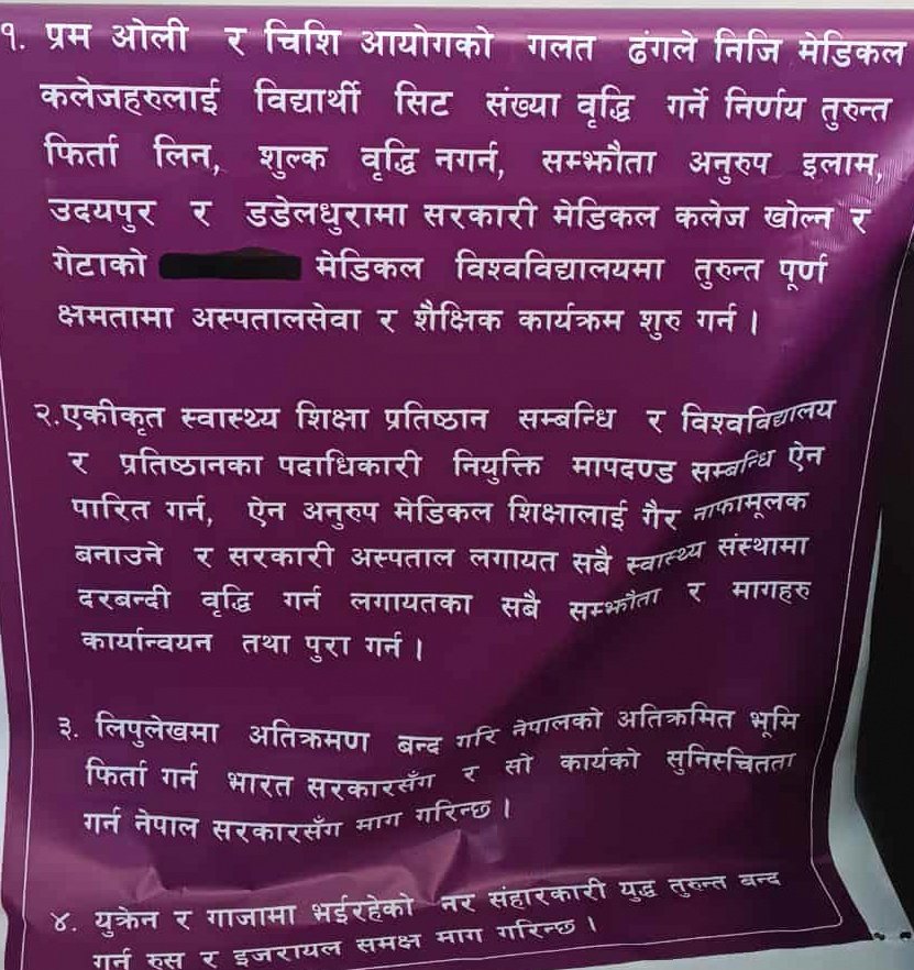 ‘अघिल्लो वर्ष सुरु भएको गाजामाथिको इजरायली आक्रमण, यस क्रममा उसले गरिरहेको जघन्य र मानवताविरुद्धका अपराध र जातीय सफायाको अभ्यासविरुद्ध पनि हामीहरूले आवाज उठाउँदै आएका छौँ ।’ ‘लिपुलेकमा भइरहेको अतिक्रमण रोकी अतिक्रमित नेपाली भूमि फिर्ता गर्न भारतलाई तथा हाल चलिरहेका नर संहारकारी युद्धहरू रोक्न रुस र इजरायललाई माग राख्दै मैले आज यही भदौ १५ गते आइतबारदेखि तीन दिने सत्याग्रह सुरु गरेको घोषणा गर्दछु,’ विज्ञप्तिमा केसीले उल्लेख गरेका छन् ।