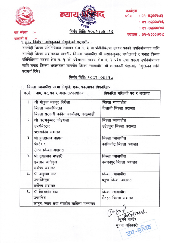 न्याय परिषद्ले ६ जना जिल्ला न्यायाधीश सिफारिस गर्ने निर्णय गरेको छ । प्रधानन्यायाधीश प्रकाशमान सिंह राउतको अध्यक्षतामा मंगलबार बसेको न्याय परिषद् बैठकले ६ जना जिल्ला न्यायाधीश नियुक्तिका लागि सिफारिस गर्ने निर्णय गरेको हो । जिल्ला सरकारी वकिल कार्यालयबाट गोकुलबहादुर निरौलालाई कैलाली जिल्ला अदालत,उपरजिष्ट्रार अरुणकुमार कोइरालालाई डडेलधुरा जिल्ला अदालतको न्यायाधीशमा सिफारिस गर्ने निर्णय गरिएको छ ।