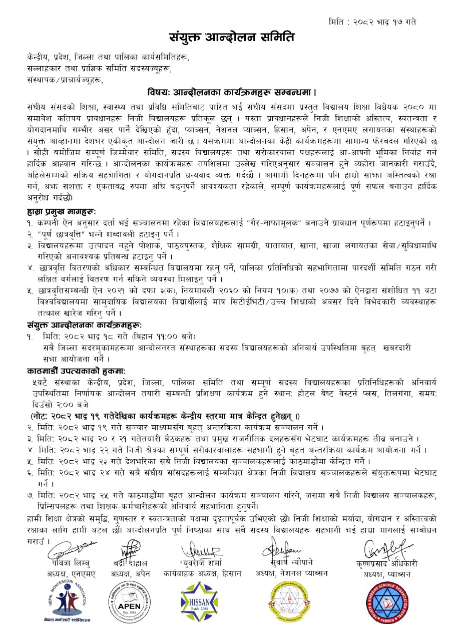 विद्यालय शिक्षा विधेयकका विरुद्ध निजी शैक्षिक संघसंस्थाहरूले संयुक्त आन्दोलनलाई अझ सशक्त रूपमा अघि बढाउने घोषणा गरेका छन्। विद्यालय शिक्षा विधेयक २०८० का कतिपय प्रावधानहरू निजी विद्यालयहरूको अस्तित्व, स्वतन्त्रता र योगदानविरुद्ध रहेको भन्दै निजी शैक्षिक संघसंस्थाहरूले आन्दोलनलाई अघि बढाउने घोषणा गरेका हुन् । प्याब्सन, नेसनल प्याब्सन, हिसान, अपेन र एनएमएको संयुक्त आव्हानमा सुरू भएको आन्दोलनलाई प्रभावकारी बनाउन आगामी दिनहरूमा विविध कार्यक्रम सञ्चालन गरिने समितिले विज्ञप्ति मार्फत जानकारी गराएको छ।