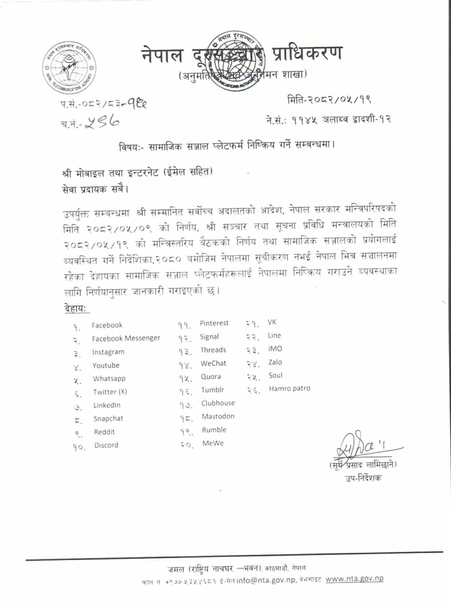 प्राधिकरणले जारी गरेको विज्ञप्तिमा भनिएको छ, ‘ सञ्चार तथा सुचना प्रविधि मन्त्रालयको मिति २०८२/०५/१९ को मन्त्रीस्तरीय बैठकको निर्णय तथा सामाजिक सञ्जालको प्रयोगलाई व्यवस्थित गर्ने निर्देशिक, २०८० बमोजिम नेपालमा सूचीकरण नभई नेपालभित्र सञ्चालनमा रहेका सामाजिक सञ्जाल प्लेटफर्महरूलाई नेपालमा निष्क्रिय गराउने व्यवस्थाका लागि निर्णयानुसार जानकारी गराइएको छ ।