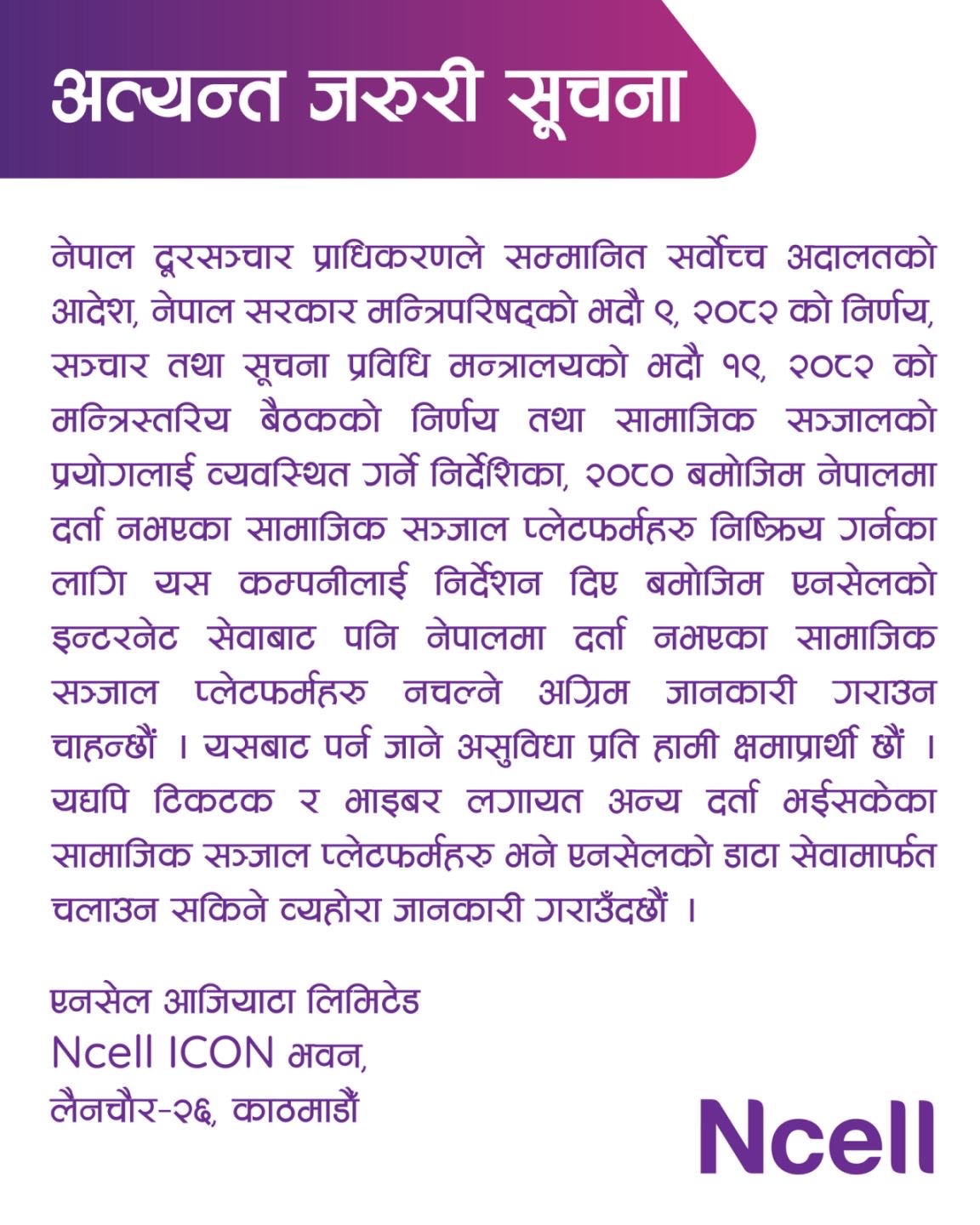 मोबाइल र इन्टरनेट सेवा प्रदायक कम्पनी एनसेलले आफ्नो मोबाइल डाटाबाट सरकारले रोक लगाएका सामाजिक सञ्जालहरू नचल्ने जानकारी गराएको छ । कम्पनीले बिहीबार एक विज्ञप्ति जारी गर्दै यसबाट पर्नसक्ने असुविधाप्रति क्षमा समेत मागेको छ ।