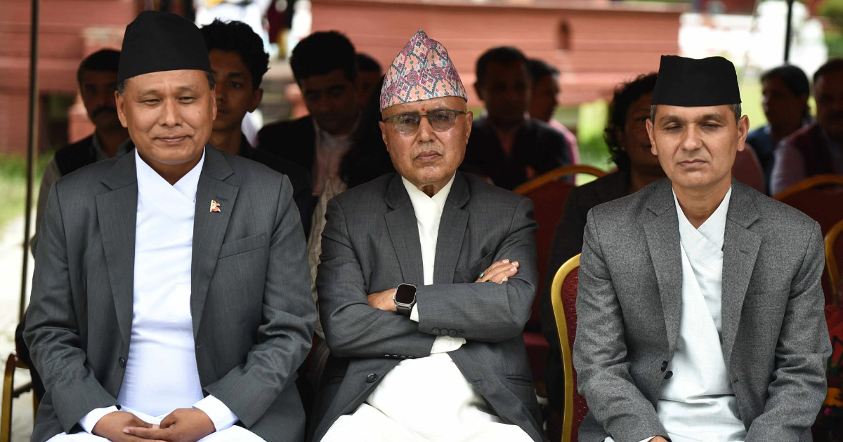 शीलतनिवासको खण्डहर भवन बाहिर तीन मन्त्रीले लिए शपथ