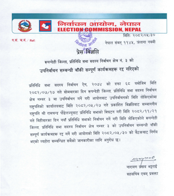 रूपन्देही जिल्ला, प्रतिनिधि सभा सदस्य निर्वाचन क्षेत्र नं. ३ को,उपनिर्वाचन सम्बन्धी बाँकी सम्पूर्ण कार्यक्रमहरू रद्द गरिएको प्रतिनिधि सभा सदस्य निर्वाचन ऐन, २०७४ को दफा ६८ बमोजिम मिति २०८२÷०७÷१७ गते सोमबारका दिन रूपन्देही जिल्ला, प्रतिनिधि सभा सदस्य निर्वाचन क्षेत्र नम्बर ३ मा उपनिर्वाचन गर्ने गरी आयोगबाट उपनिर्वाचनको मिति तोकिएकोमा राष्ट्रपतिको कार्यालयबाट मिति २०८२÷०५÷२७ गते प्रकाशित विज्ञप्तिबाट सम्माननीय राष्ट्रपति श्री रामचन्द्र पौडेलज्यूबाट प्रतिनिधि सभाको विघटन गरी मिति २०८२÷११÷२१ गते बिहीबारका दिन नयाँ प्रतिनिधि सभाको निर्वाचन गर्ने गरी मिति तोकिएकोले रूपन्देही जिल्ला, प्रतिनिधि सभा सदस्य निर्वाचन क्षेत्र नम्बर ३ को उपनिर्वाचन सम्बन्धी बाँकी सम्पूर्ण कार्यक्रमहरू रद्द गर्ने गरी आयोगको मिति २०८२÷०५÷३० को बैठकबाट निर्णय भएको व्यहोरा सम्बन्धित सबैको जानकारीका लागि अनुरोध छ ।