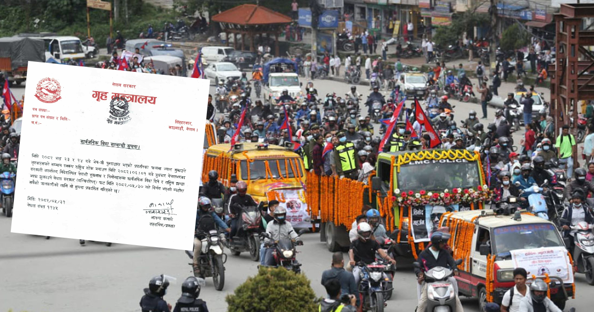 नेपाल सरकारले यही भदौ २३ र २४ गते भएको जेनजी प्रदर्शनका क्रममा ज्यान गुमाउने मृतकको सम्मानस्वरूप बुधबार राष्ट्रिय शोक बिदा दिने भएकाे छ । मन्त्रिपरिषद्को सोमबारको निर्णयअनुसार असोज १ गते राष्ट्रिय शोक दिवसका दिन बुधबार देशभरका सरकारी कार्यालय, विदेशस्थित नेपाली दूतावास तथा नियोगमा सार्वजनिक बिदा दिइएको गृह मन्त्रालयले जनाएको हो ।
