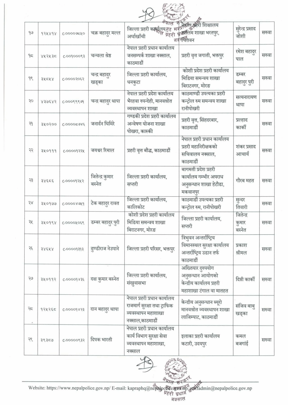 नेपाल प्रहरीका ९० जना प्रहरी नायब उपरीक्षक(डीएसपी) को सरुवा गरिएको छ। प्रहरी महानिरीक्षक(आईजीपी) चन्द्र कुवेर खापुङले बुधबार राति ठूलो संख्यामा प्रहरी अधिकारीहरूको सरुवा गर्ने निर्णय गरेका हुन्।
