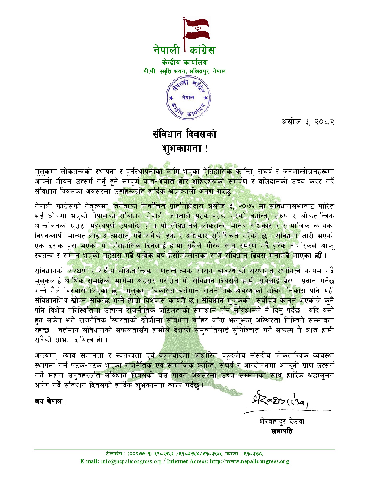 संविधान दिवसको अवसरमा नेपाली कांग्रेसका सभापति एवं पूर्वप्रधानमन्त्री शेरबहादुर देउवाले सम्पूर्ण नेपाली जनतालाई शुभकामना व्यक्त गर्दै लोकतन्त्र, मानव अधिकार र सामाजिक न्यायका मूल्यहरू समेटिएको वर्तमान संविधानलाई संरक्षण गर्दै राष्ट्रलाई समृद्धिको दिशामा लैजान सबैमा आह्वान गरेका छन् । संविधान दिवसका अवसरमा शुभकामना सन्देश जारी गर्दै सभापति देउवाले नेपाली जनताले पटक–पटक गरेका ऐतिहासिक आन्दोलन, संघर्ष र क्रान्तिको फलस्वरूप २०७२ सालको असोज ३ गते संविधान जारी भएको स्मरण गराउँदै त्यसमा योगदान दिने सम्पूर्ण ज्ञात–अज्ञात शहीदप्रति श्रद्धाञ्जली अर्पण गरेका छन् ।
