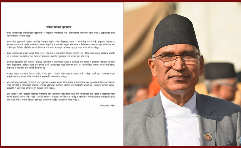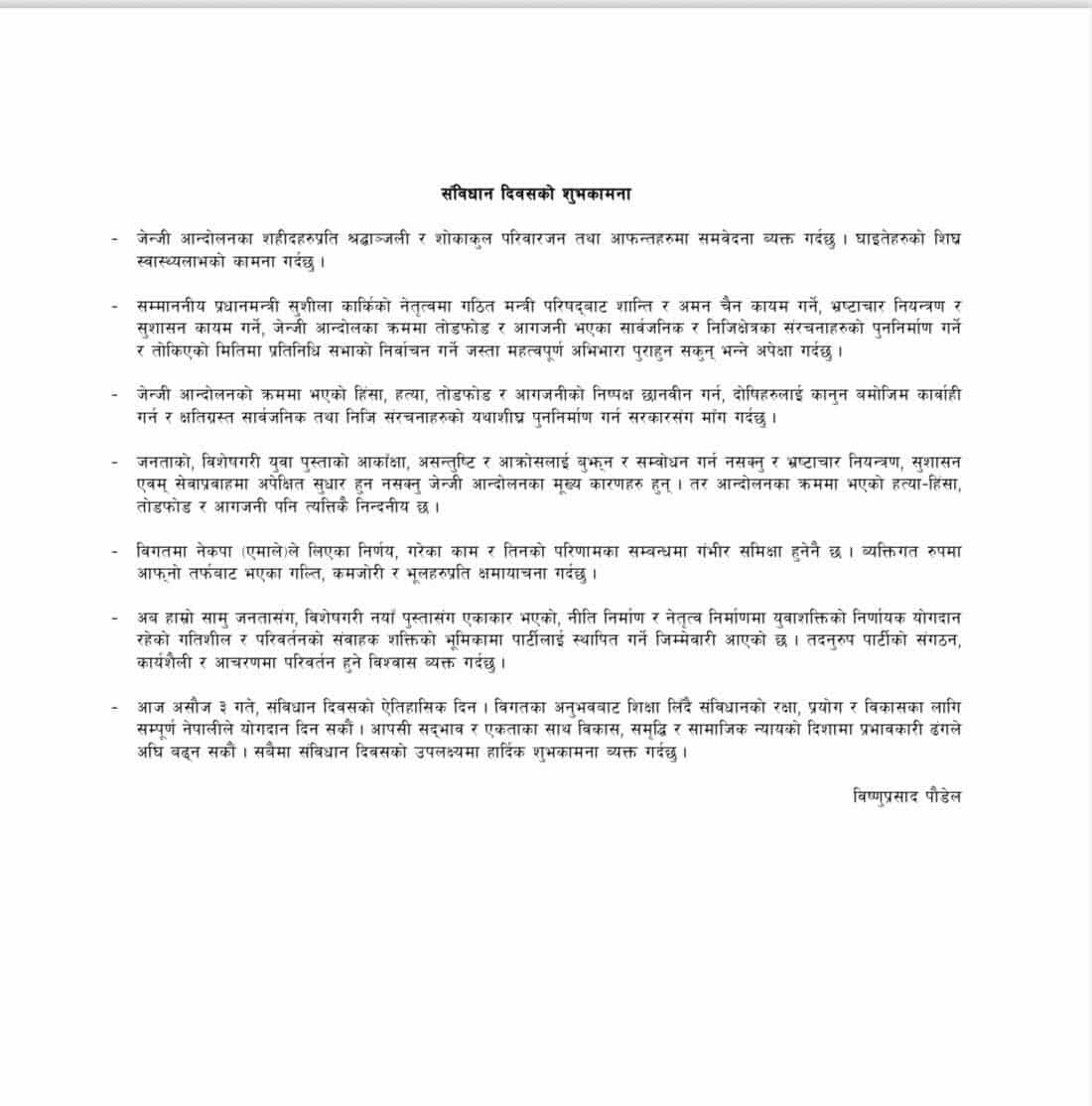 संविधान दिवसका अवसरमा नेकपा (एमाले) का उपाध्यक्ष तथा पूर्वअर्थमन्त्री विष्णुप्रसाद पौडेलले देशमा शान्ति, सुशासन, पुनर्निर्माण र जवाफदेहिताको अपेक्षा व्यक्त गरेका छन् । एक विज्ञप्ति मार्फत पौडेलले संविधान दिवसको शुभकामना दिँदै हालै सम्पन्न जेनजी आन्दोलनका क्रममा शहीद भएकाहरूप्रति श्रद्धाञ्जली अर्पण गरेका छन् भने शोकसन्तप्त परिवारजन र घाइतेप्रति समवेदना र शीघ्र स्वास्थ्यलाभको कामना समेत गरेका छन् ।