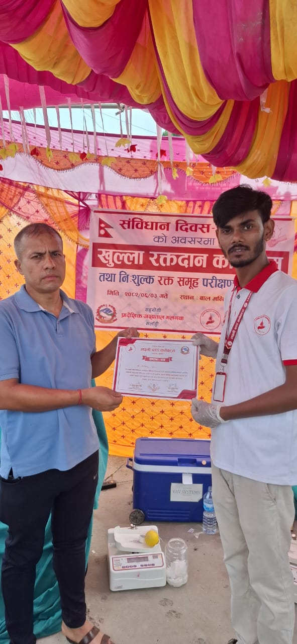 संविधान दिवस–२०८२ को अवसरमा मंगलबार लक्ष्मी ब्लड कनेक्ट्स, सर्लाहीको आयोजनामा र प्रादेशिक अस्पताल मलंगवाको सहयोगमा खुला रक्तदान तथा निःशुल्क रक्तसमूह परीक्षण कार्यक्रम सम्पन्न भएको छ।