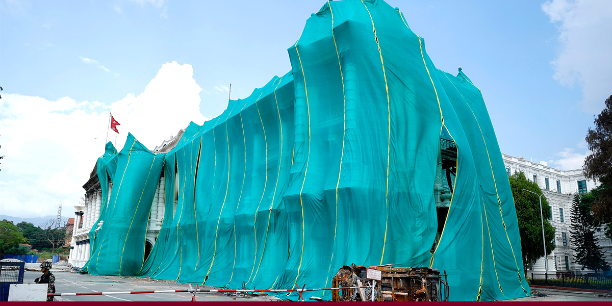 ऐतिहासिक सरकारी भवन सिंहदरबार त्रिपालले ढाकिएको छ। गत भदाै २३ र २४ गते जेनजी आन्दोलनको क्रममा लागेको आगलागीले क्षति पुर्याएको कारण मर्मत सम्भारको काम सुरु भएपछि भवनलाई अस्थायी रूपमा त्रिपालले छोपिएको हो। सिंहदरबारलाई सुरक्षित राख्दै संरचनागत क्षति न्यूनीकरण गर्न प्राविधिक टोलीले अस्थायी आवरण निर्माण गरी भित्रि भागमा मर्मत कार्य अगाडि बढाइरहेको छ। भवनको छत, झ्यालढोका, भित्तो र आन्तरिक सजावटसमेतलाई मर्मत गर्ने तयारी भइरहेको छ।