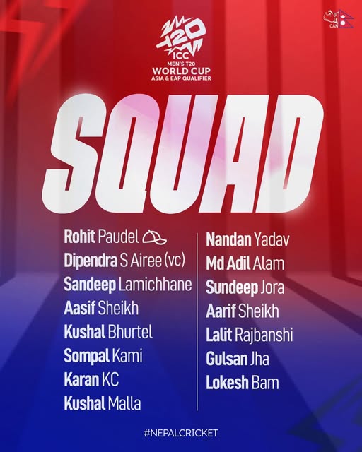 नेपाल क्रिकेट सङ्घ (क्यान) ले अन्तर्राष्ट्रिय क्रिकेट काउन्सिल (आईसीसी) को आयोजनामा आगामी बुधबारदेखि ओमानमा हुने आईसीसी पुरुष टी–२० विश्वकप २०२६ को एसिया तथा इस्ट एसिया प्यासिफिक छनोट खेलका लागि १५ सदस्यीय टोली घोषणा गरेको छ । संयुक्त अरब इमिरेट्स (युएई) मा वेस्ट इन्डिजविरुद्धको तीन शृङ्खला खेल्न गएको १६ सदस्यीय टोलीका सदस्यमध्ये साहब आलम भने टोलीबाट बाहिरिएका क्यानका प्रवक्ता छुम्बी लामाले जानकारी दिए । त्यसैगरी, टोलीमा सन्दीप लामिछानेलाई पनि समावेश गरिएको छ । यसअघि उनले वेस्ट इन्डिजसँगको सिरिजको पहिलो खेल सुरु हुनु करिब ४५ मिनेट अगाडि मैदानमा उत्रन अस्वीकार गरेका थिए ।
