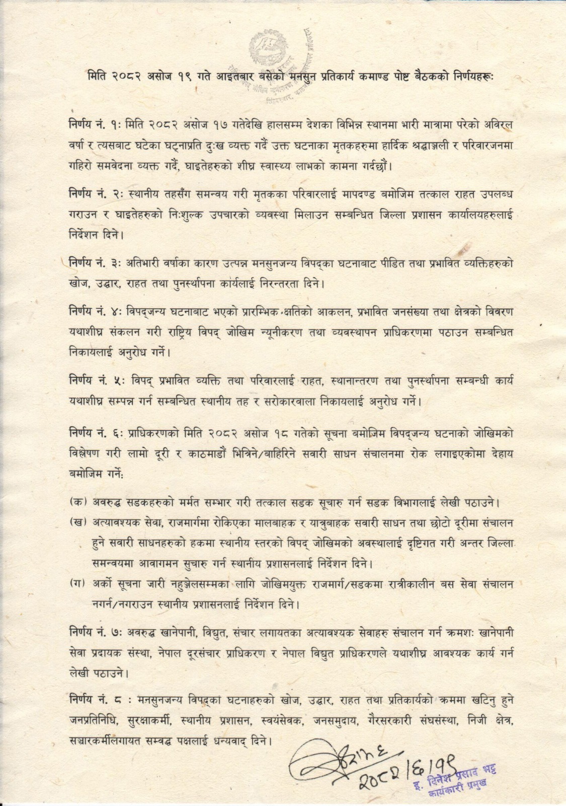 शभर जारी लगातारको भारी वर्षाका कारण उत्पन्न मनसुनजन्य विपद्को प्रभाव न्यूनीकरण गर्न मनसुन प्रतिकार्य कमाण्ड पोष्टको बैठक आइतबार बसेको छ । बैठकले विपद् व्यवस्थापन तथा प्रतिकार्यका लागि आठ वटा महत्वपूर्ण निर्णयहरू गरेको छ । असोज १७ देखि देशका विभिन्न स्थानमा परेको अविरल वर्षा र त्यसबाट भएका जनधनको क्षतिप्रति गहिरो दुःख व्यक्त गर्दै बैठकले मृतकप्रति श्रद्धाञ्जली तथा पीडित परिवारप्रति समवेदना व्यक्त गरेको छ । साथै, घाइतेहरूको शीघ्र स्वास्थ्य लाभको कामना पनि गरिएको छ ।