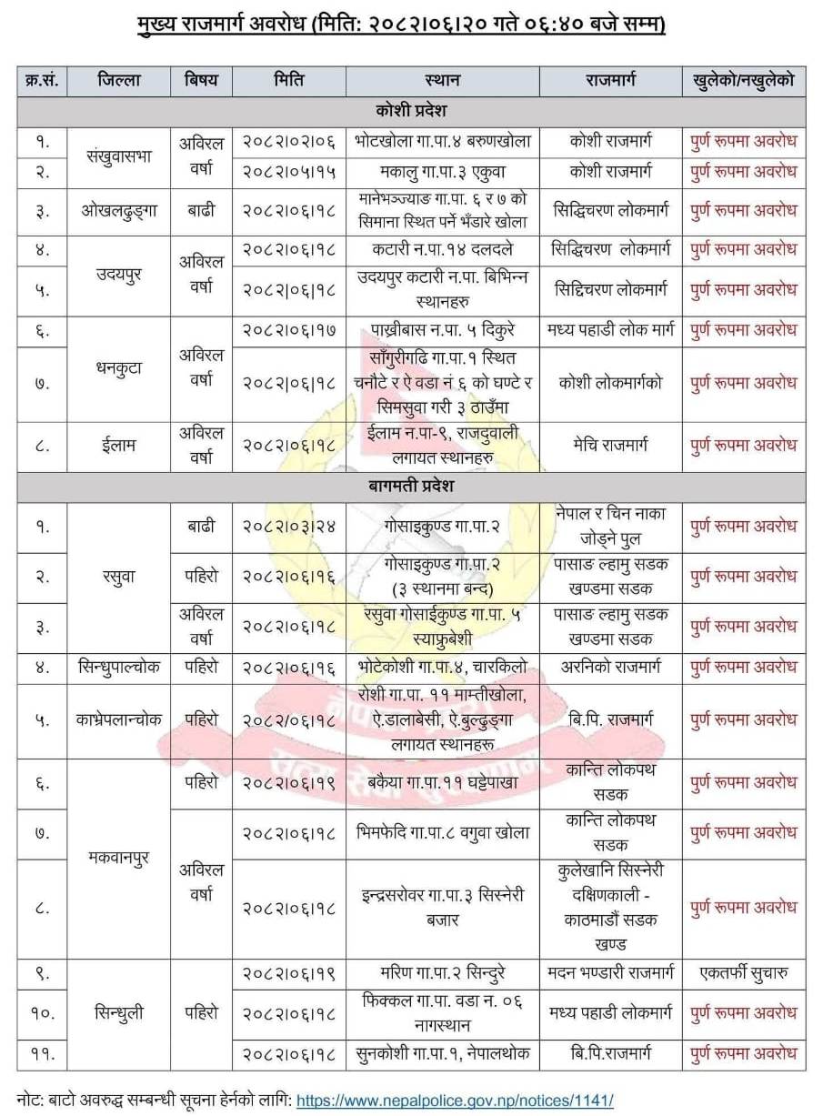 कोशी र बागमतीका १९ ठाउँमा सडक पूर्णरुपमा अवरुद्ध