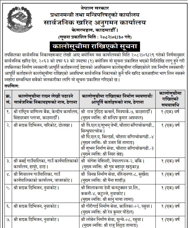 प्रधानमन्त्री कार्यालय मातहतको सार्वजनिक खरिद अनुगमन कार्यालयले २५ वटा निर्माण कम्पनीलाई कालो सूचीमा राखेको छ। कार्यालयले आज सूचना जारी गर्दै विभिन्न निकायबाट कालो सूचीमा राख्नको लागि लेखि पठाएअनुसार ती निर्माण कम्पनीलाई कालो सूचीमा राखिएको जानकारी दिएको हो।