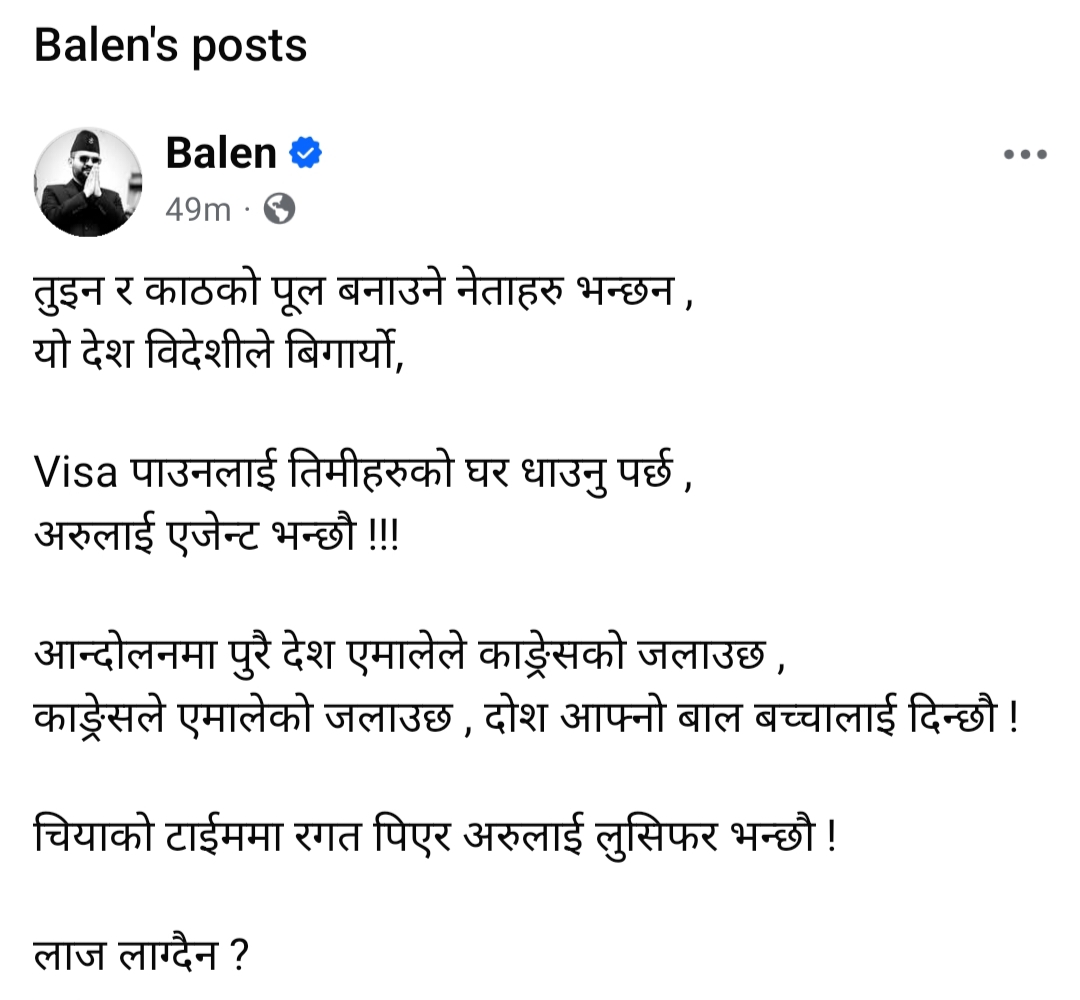 काठमाडौँ महानगरका प्रमुख बालेन शाहले नेताहरूप्रति कटाक्ष गरेका छन् । बुधबार साँझ सामाजिक सञ्जाल फेसबुकमा स्ट्याटस लेख्दै महानगर प्रमुख शाहले गत भदौ २३ र २४ गतेको घटनालाई लिएर नेताहरूमाथि कटाक्ष गरेका हुन् ।