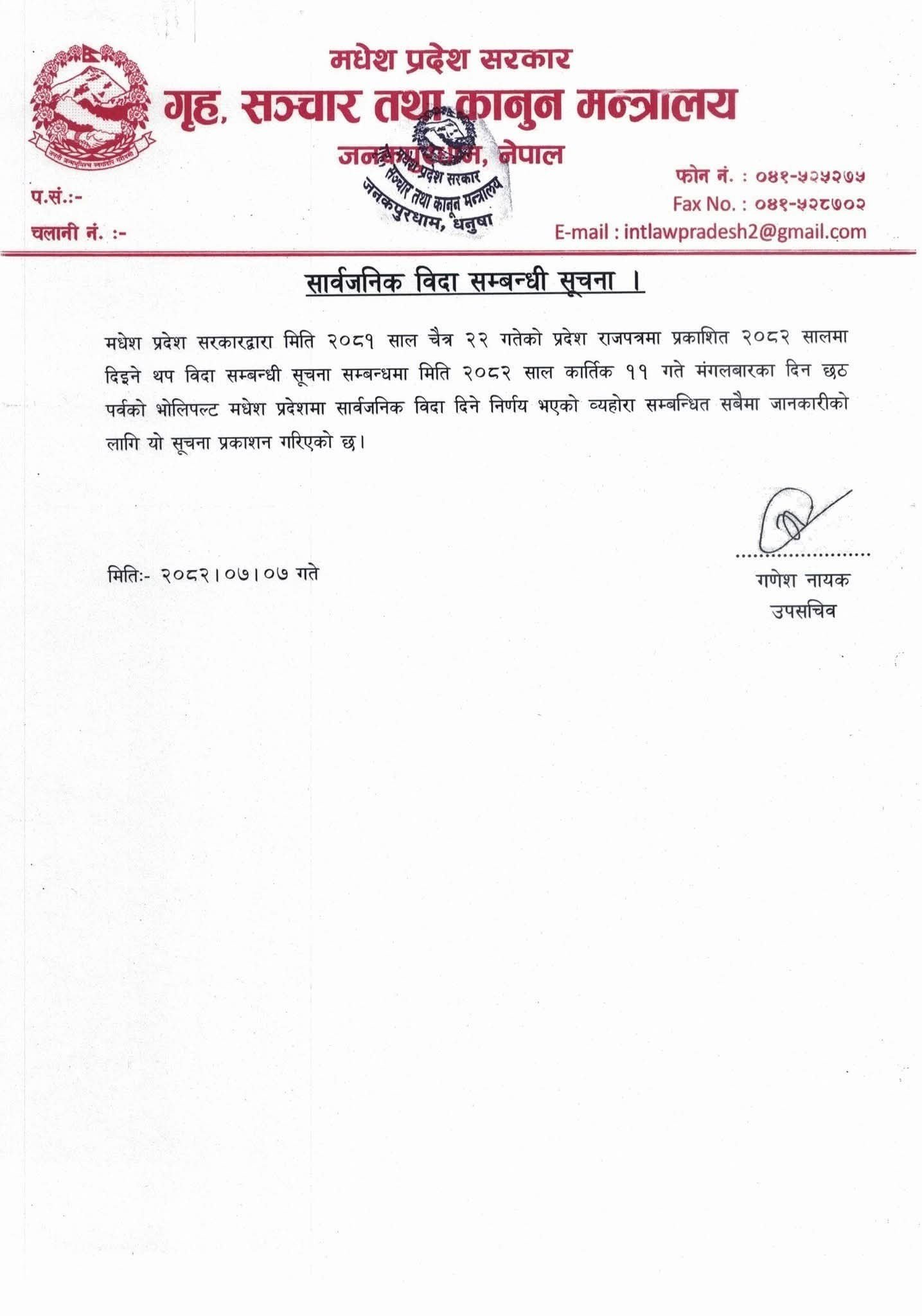 मधेस प्रदेश सरकारले छठ पर्वको अवसरमा एक दिन थप सार्वजनिक बिदा दिने निर्णय गरेको छ। प्रदेश सरकारको गृह, सञ्चार तथा कानुन मन्त्रालयले आज (शुक्रबार) विज्ञप्ति जारी गर्दै छठको उदाउँदो सूर्यको दिन अर्थात् कार्तिक ११ गते मंगलबार पनि सार्वजनिक बिदा दिने जानकारी दिएको छ।