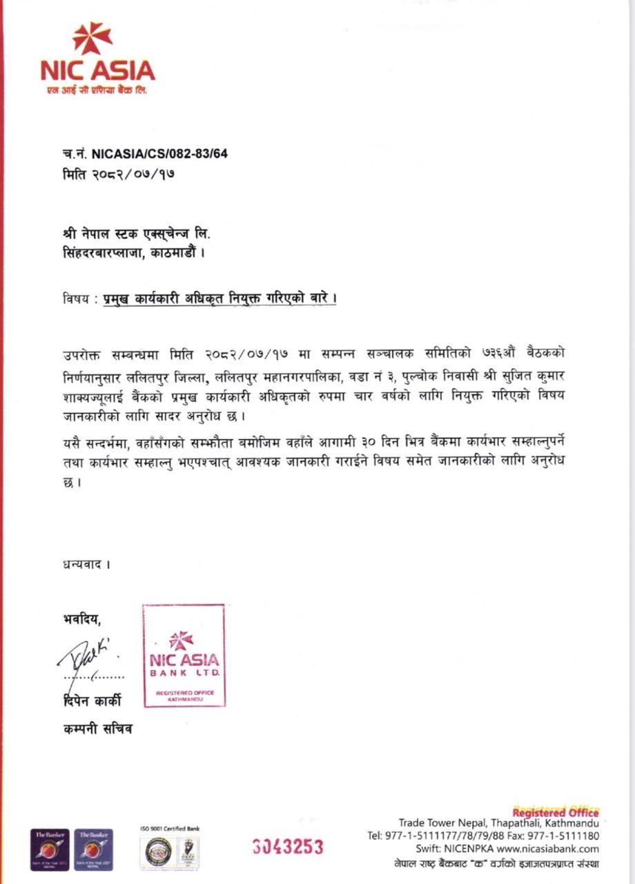 एनआइसी एशिया बैंकको प्रमुख कार्यकारी अधिकृतमा सुजित कुमार शाक्य नियुक्त