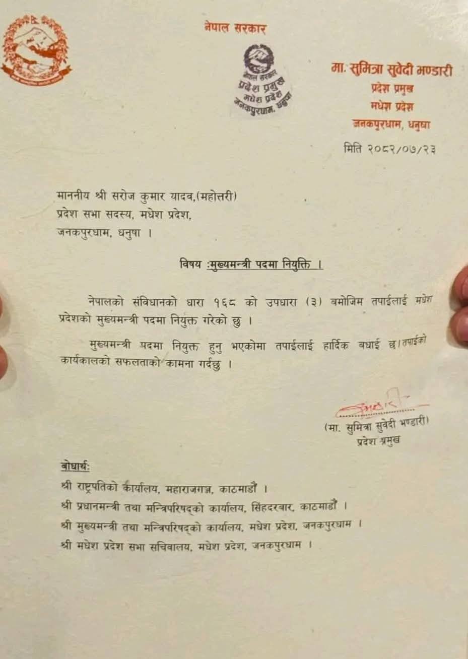 मधेश प्रदेश प्रमुख सुमित्रा सुवेदी भण्डारीले नेकपा एमाले संसदीय दलका नेता सरोजकुमार यादवलाई मुख्यमन्त्री नियुक्त गरेकी छन् । मुख्यमन्त्री जितेन्द्र सोनलले पदबाट राजीनामा दिएकाले संविधानको धारा १६८ को उपधारा ३ बमोजिम प्रदेश सभाको सबैभन्दा ठूलो दलको नाताले एमाले नेता यादव मुख्यमन्त्री नियुक्त भएका हुन् ।
