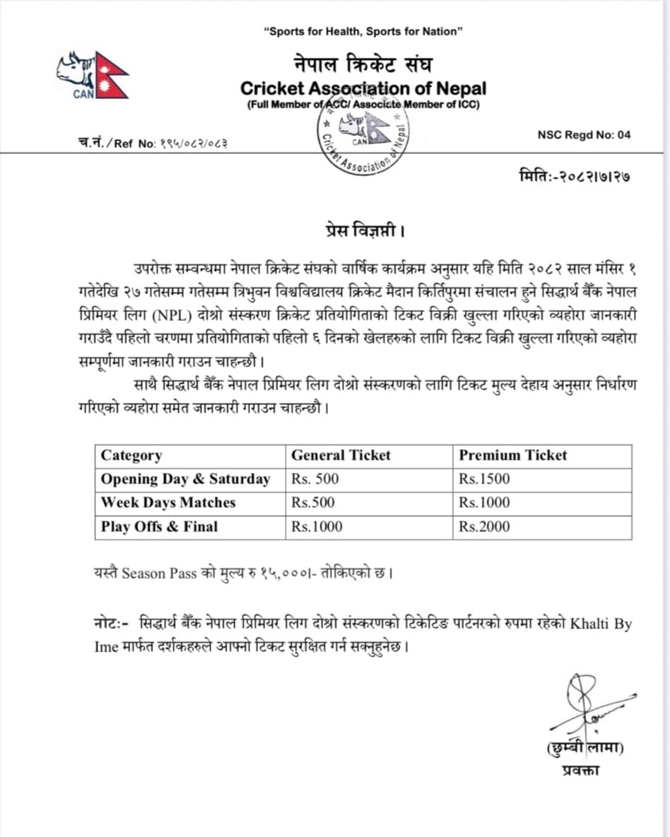 नेपाल क्रिकेट सङ्घ (क्यान)ले दोस्रो संस्करणको नेपाल प्रिमियर लिग (एनपीएल) का लागि टिकट बिक्री खुल्ला गरेको छ । मङ्सिर १ गतेदेखि २७ गतेसम्म त्रिभुवन विश्वविद्यालय क्रिकेट मैदान, कीर्तिपुरमा हुने एनपीएल दोस्रो संस्करण प्रतियोगिताका लागि विभिन्न दरमा टिकट बिक्री सुरु गरेको हो । क्यानले एक सूचना जारी गर्दै दर्शकका लागि पहिलो चरणमा हुने प्रतियोगिताको पहिलो ६ दिनको खेलहरुको लागि टिकट बिक्री खुल्ला गरेको जानकारी दिएको छ ।