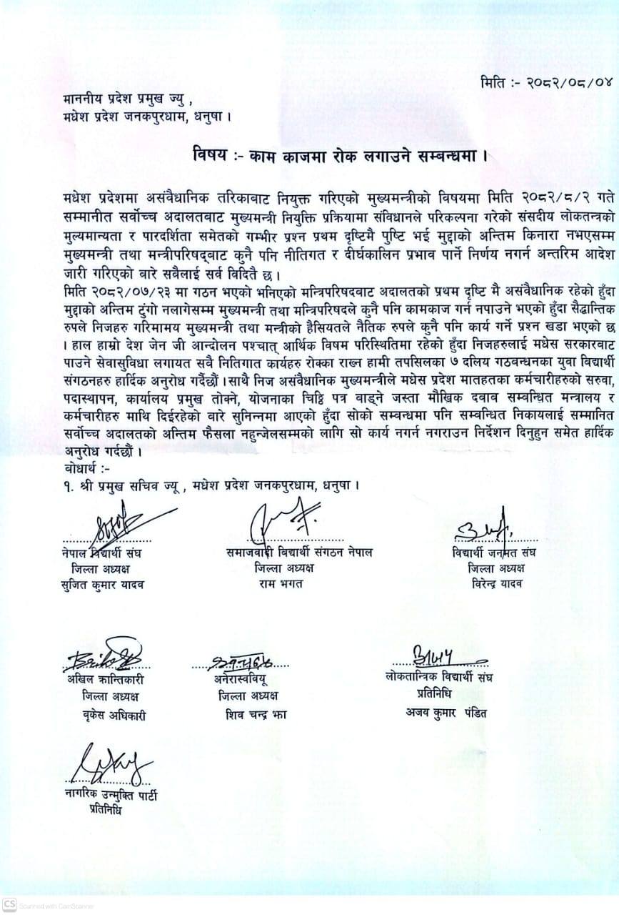 मधेश प्रदेशका मुख्यमन्त्री सरोज कुमार यादवको गतिविधि रोक्का गर्न माग गर्दै जनकपुरधामका विभिन्न युवा संगठनमा आवद्ध युवाहरुले माग गरेका छन् सर्वोच्च अदालतले नीतिगत तथा दिर्घकालिन प्रभाव पार्ने निर्णय गर्न रोक लगाएको मधेश प्रदेशका मुख्यमन्त्री यादवको गतिविधि रोक्का राख्न माग गर्दै सात दल निकट युवा संगठनहरुले बिहीबार (आज) मेधश प्रदेशका प्रदेश प्रमुख डां सुरेन्द्र लाभ कर्ण समक्ष माग गरेको छ ।