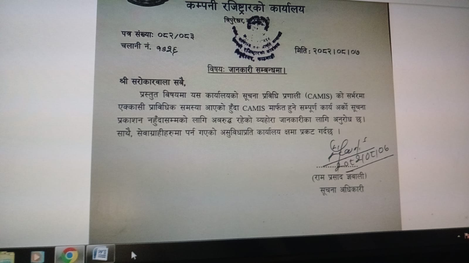 कार्यालयले चालू आर्थिक वर्षदेखि कम्पनीसम्बन्धि सबै काम भौतिक उपस्थितविना नै क्यामिस प्रणालीबाट गर्दै आएको छ ।