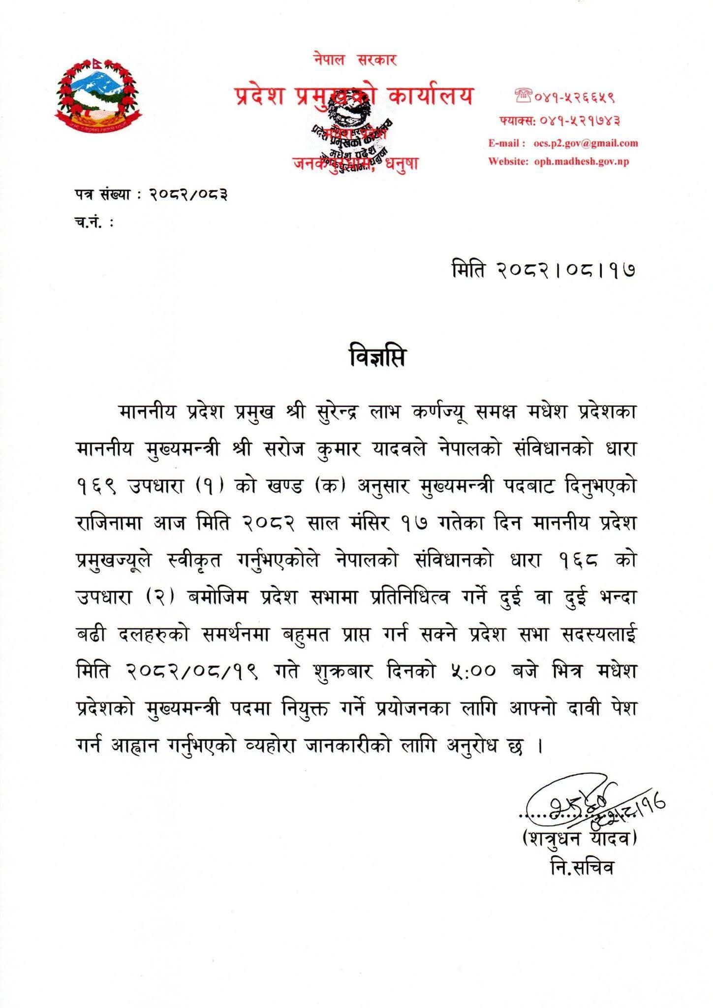 प्रदेश प्रमुखको कार्यालयले संविधानको धारा १६८ को उपधारा २ बमोजिम अगामी शुक्रवार १९ गते साँझ ५ बजे भित्रमा सरकार गठनका लागि दाबी पेश गर्नका लागि दलहरुलाई आह्वान गरेको छ । यो संगै दलहरु पुनः छलफलमा जुटेका छन् । आज दिउँसो बसेको मधेश प्रदेश सभाको बैठकमा मुख्यमन्त्री सरोज कुमार यादवले विश्वासको मत लिने भनिएकोमा उनले बैठकमै राजीनामा दिएको घोषणा गरेका थिए ।