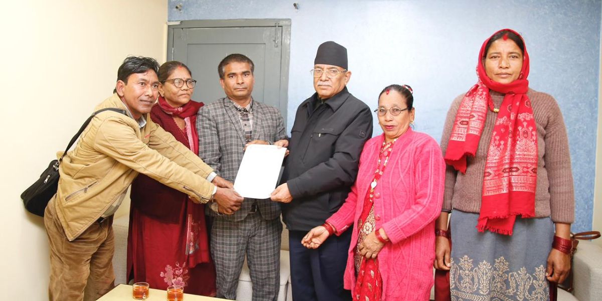 समितिका अध्यक्ष अजय वैगारसहितको केन्द्रीय कार्यसमितिले सोमबार पार्टी केन्द्रीय कार्यालय,पेरिसडाँडामा संयोजक प्रचण्डलाई भेटी ज्ञापनपत्र बुझाएको हो। दीर्घकालीन रूपमा भूमिहीन, सुकुम्बासी तथा विपन्न नागरिकको जीवनस्तर सुधारका लागि राज्यले प्रभावकारी कदम चाल्नुपर्ने भन्दै समितिले त्यसका लागि सक्रिय पहल गरिदिन आग्रह गरेको हो।