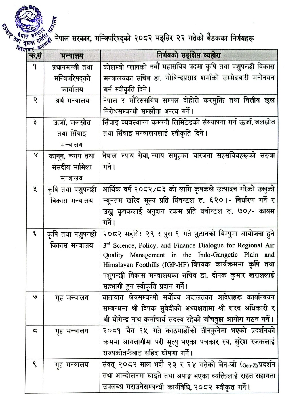 सरकारले सोमबार बसेको मन्त्रिपरिषद् बैठकका निर्णय सार्वजनिक गरेको छ । मङ्गलबार सरकारका प्रवक्ता एवम् सञ्चार तथा सूचना प्रविधिमन्त्री जगदीश खरेलले पत्रकार सम्मेलन गर्दै मन्त्रिपरिषद् बैठकका निर्णय सार्वजनिक गरेका हुन् ।