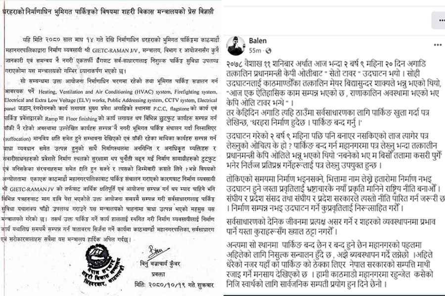 शहरी विकास मन्त्रालयले समन्वय नै नगरी निर्माणाधीन धरहराको बेसमेन्टमा पार्किङ गराएको भन्दै महानगरपालिकाको ध्यानाकर्षण गराएको थियो । मन्त्रालयले निर्माणाधीन अवस्थामा रहेको ठाउँमा पार्किङ गर्दा जोखिम हुने भन्दै पत्र पठाएपछि बालेनले उद्घाटन भएको २ वर्ष ९ महिनासम्म पनि निर्माणाधीन भन्नु लाजमर्दो भएको टिप्पणी गर्दै पार्किङ बन्द नहुने जवाफ दिएका हुन् । तत्कालीन प्रधानमन्त्री केपी शर्मा ओलीले धरहरा उद्घाटन गर्दा दिएको अभिव्यक्तिको स्मरण गराउँदै बालेनले भनेका छन्, ‘पार्किङ बन्द गर्न महानगरमा पत्र लेख्नुभन्दा ‘नबनेको भए म बीसौं तलामा कसरी पुगें’ भनेर निर्लज्ज प्रतिप्रश्न गर्नेहरूलाई पत्र लेख्नु उपयुक्त हुन्छ ।’