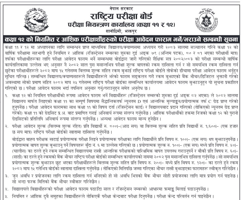 बोर्डले सम्बन्धित मावि तथा क्याम्पसहरूलाई यही पुस मसान्तभित्र फारम भर्न भनेको छ। बिलम्ब शुल्क तिरेर माघ १५ गतेसम्म पनि फारम भर्न सकिने छ।
