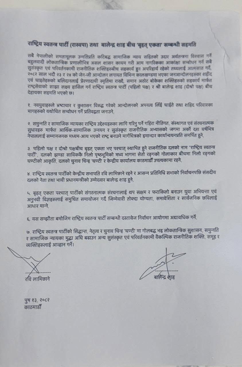 राष्ट्रिय स्वतन्त्र पार्टी (रास्वपा) र काठमाडौं महानगरपालिकाका प्रमुख बालेन्द्र शाह (बालेन) बीच ‘बृहत् एकतासम्बन्धी सहमति’ भएको छ । लामो समयदेखिको रस्साकस्सीपछि आज बिहान ४:१५ मा उनीहरूबीच एकताको सहमति भएको हो । सहमतिमा २३ र २४ भदौमा भएको जेन–जी आन्दोलनसहित विभिन्न कालखण्डका जनआन्दोलनमा शहीद तथा घाइतेले गरेको बलिदानलाई प्रेरणाका रूपमा आत्मसात गर्दै समान अठोट बोकेका परिवर्तनकामी शक्तिहरूको सहकार्यमार्फत राष्ट्रसेवाको साझा लक्ष्य हासिल गर्ने प्रतिबद्धता जनाइएको छ ।