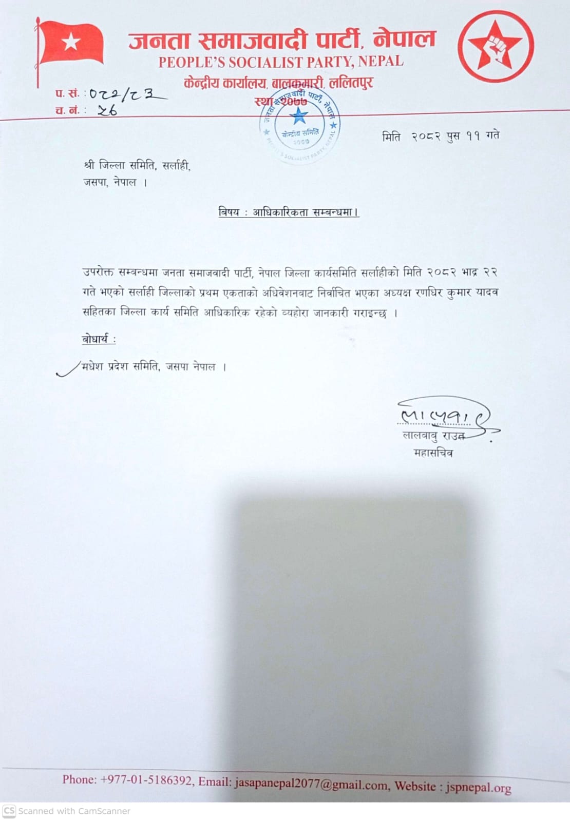 केन्द्रीय कार्यालयले सर्लाही जिल्ला समितिलाई सम्बोधन गर्दै पठाएको पत्रमा उक्त अधिवेशनबाट निर्वाचित जिल्ला कार्यसमितिले पार्टीको विधान र प्रक्रियाअनुसार वैधता प्राप्त गरेको उल्लेख गरिएको छ। पार्टीभित्र पछिल्लो समय देखिएको आधिकारिकतासम्बन्धी अन्योललाई समाप्त पार्न यो पत्र जारी गरिएको बताइएको छ।