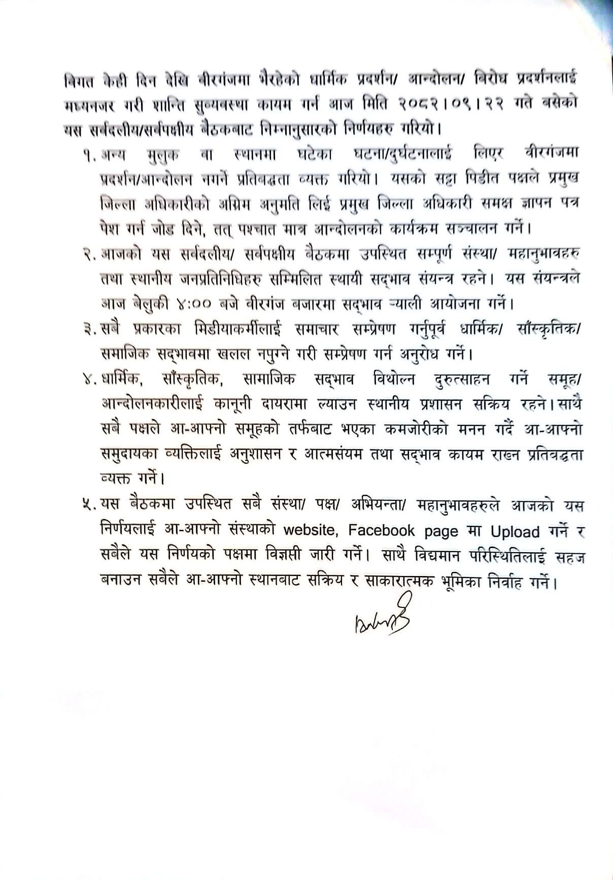 वीरगञ्जमा धार्मिक सद्भाव कायम राख्न सर्वपक्षीय सहमति, अनुमति बिना प्रदर्शन गर्न नपाइने