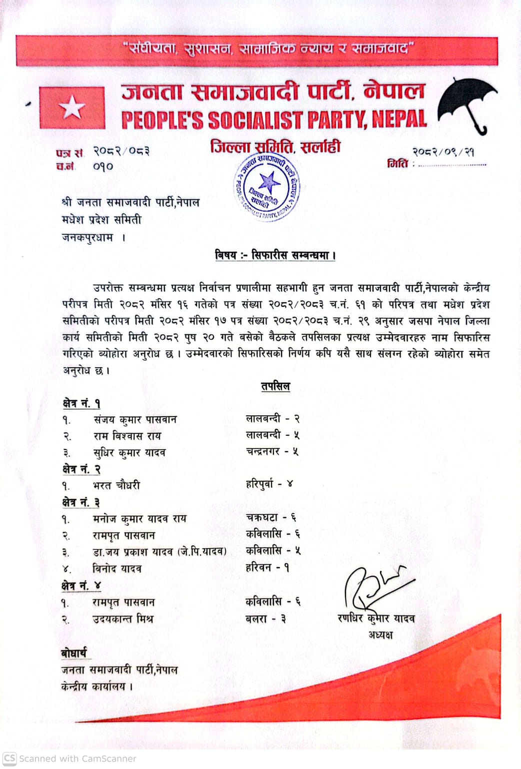 जिल्ला समिति सर्लाहीका अध्यक्ष रणधिर कुमार यादवद्वारा हस्ताक्षरित पत्रमार्फत यी सिफारिसहरू पार्टीको केन्द्रमा पठाइएको जिल्ला समितिले जानकारी दिएको छ। जसपा नेपालले “संघीयता, सुशासन, सामाजिक न्याय र समाजवाद”लाई मूल नाराका रूपमा लिँदै आगामी निर्वाचनलाई लक्षित गरी संगठनात्मक तयारी तीव्र बनाउँदै लगेकाे पनि समितिले जनाएको छ।