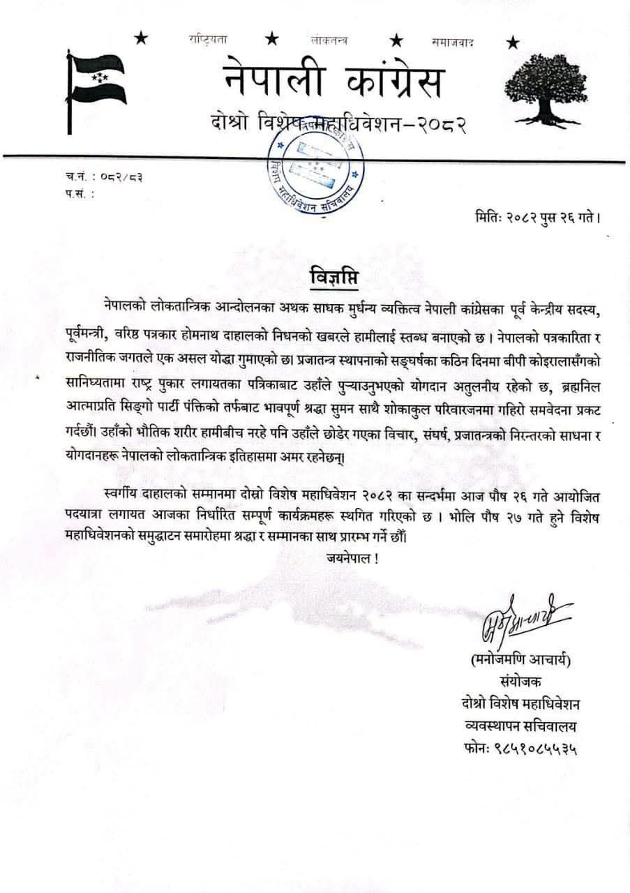 नेपाली कांग्रेसको दोस्रो महाधिवेशन व्यवस्थापन सचिवालयले कांग्रेसका नेता, प्रजातान्त्रिक आन्दोलनका योद्धा एवं अग्रज पत्रकार होमनाथ दाहालको निधन भएका कारण शोक मनाउन आजका औपचारिक कार्यक्रम स्थगित गरिएको जनाएको छ ।
