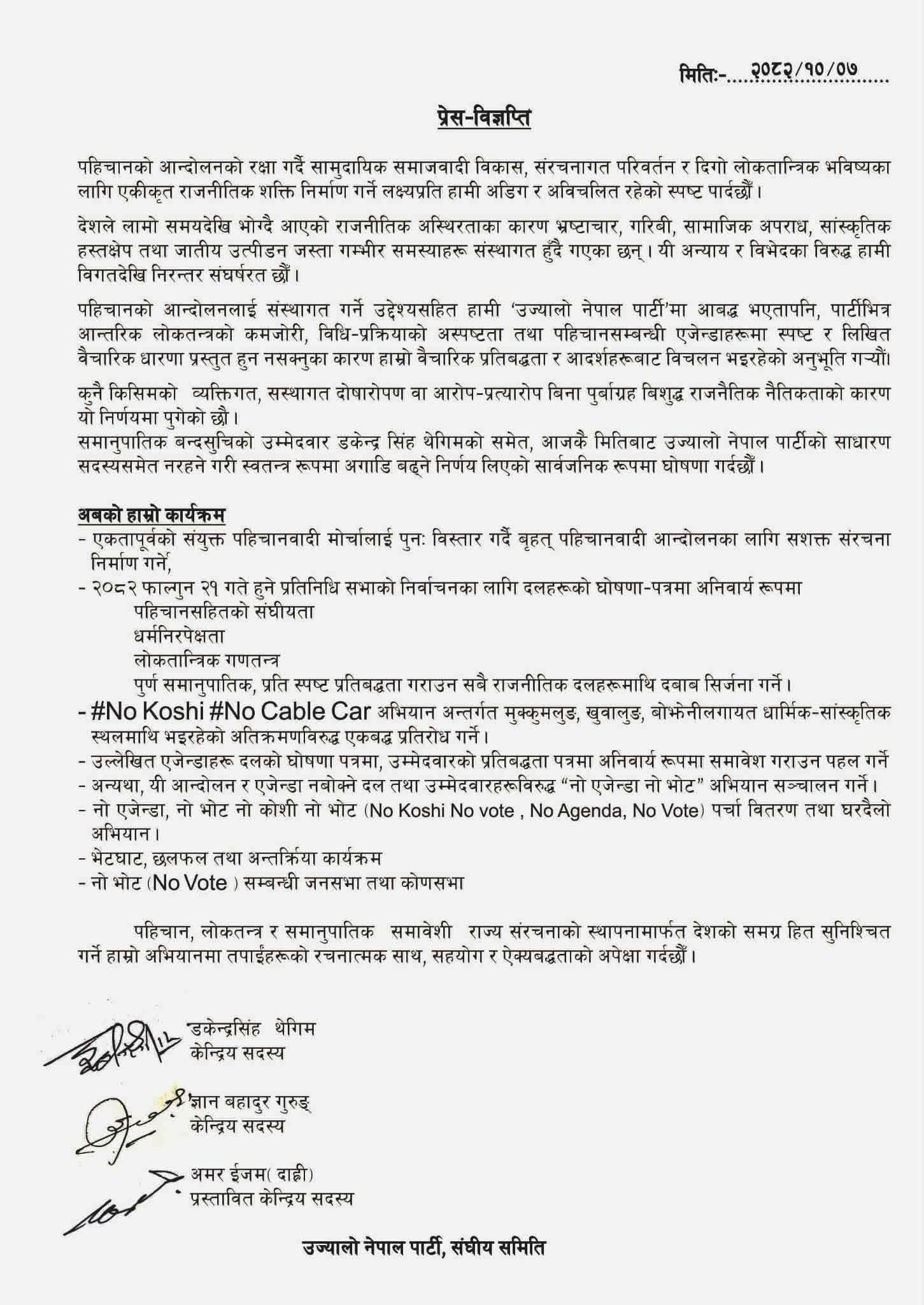 यसअघि उनीहरु लामो समयदेखि अरुण पूर्वका नौ जिल्लालाई लिम्बुवान नामाकरण हुनु पर्ने भन्दै आन्दोलनको नेतृत्वमा थिए । उज्यालो नेपाल पार्टी भित्र आन्तरिक लोकतन्त्र अत्यान्त कमजोर, विचार, विधि, प्रक्रिया अस्पष्ट, पहिचानसम्बन्धी एजेन्डा लिखितरुपमा नभएको भन्दै पार्टी छाडेको उनीहरुले निकालेको विज्ञप्तिमा उल्लेख छ । पार्टी परित्यागपछि आफूहरु स्वतन्त्र रहेर संयुक्त पहिचानवादी मोर्चालाई सशक्त बनाउने उल्लेख छ । उज्यालो नेपाल पार्टीबाट डकेन्द्रसिंह थेगिमको नाम आदिबासी जनजाति क्लष्टरको तेस्रो नम्बरको समानुपातिक उमेदवारमा समावेश छ । कुलमान घिसिङले पार्टी गठन गरेपछि रास्वपासँग एकतापछि विभाजन हुँदा केही नेता रास्वपामै रहेर पहिलो धक्का पाएका थिए ।